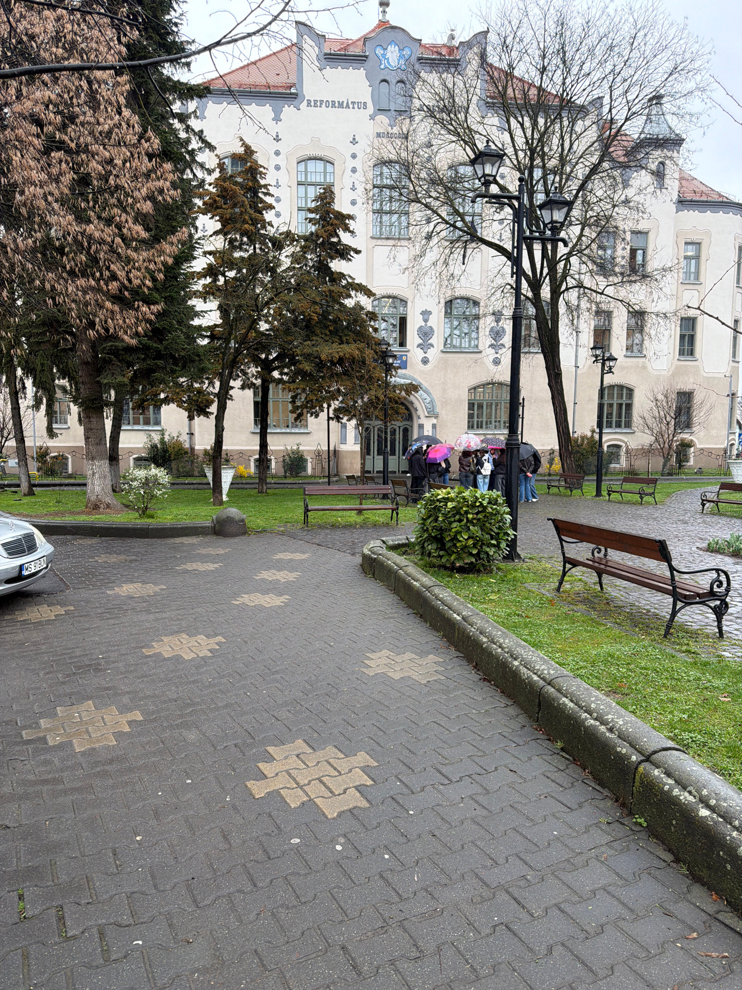 The image shows a park in Târgu Mureș, Romania. The pavement has a pattern of interlocking blocks, with lighter-colored blocks forming a cross-like design. A curb separates the pavement from a strip o…read more