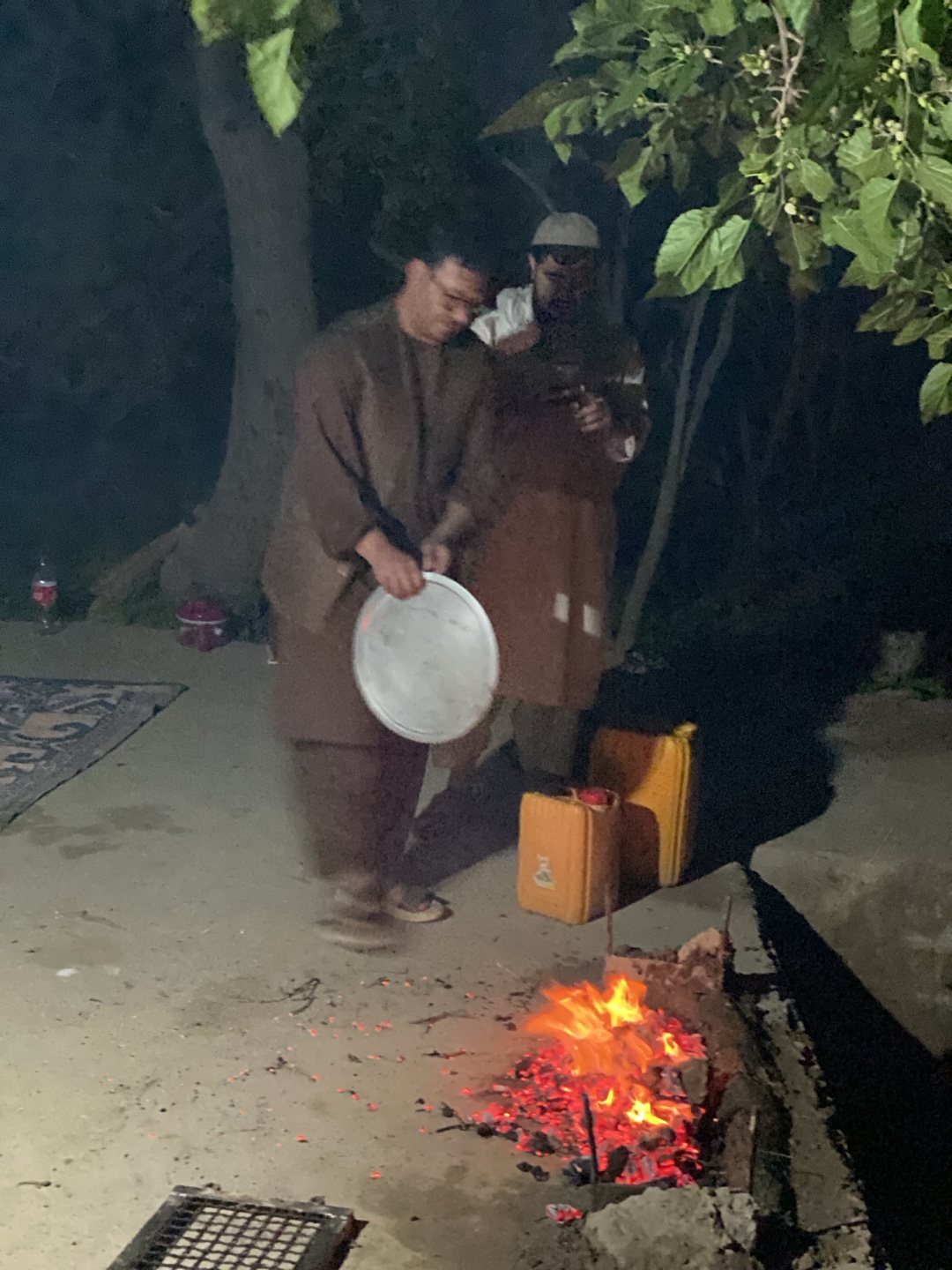 The image shows a nighttime scene in Dehkheshk, Afghanistan. Two men are near a fire. One man, wearing glasses and a brown outfit, holds a large metal plate. The other man, wearing a white cap and a dโฆread more