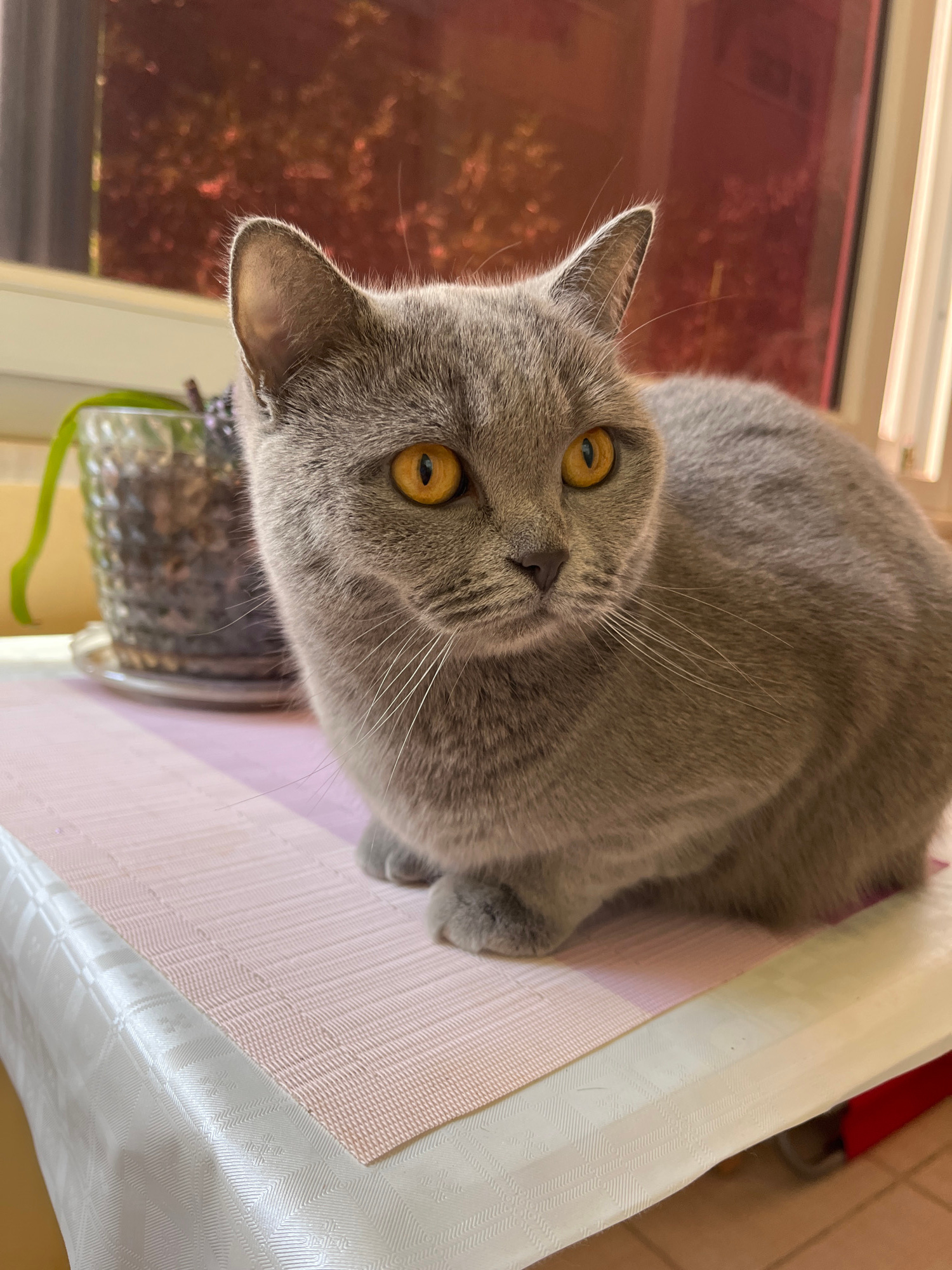 A gray, short-haired cat with yellow eyes is lying on a white table. The cat is positioned near a window with a reddish tint. A clear glass container holding a dark substance, possibly dirt and plants…read more