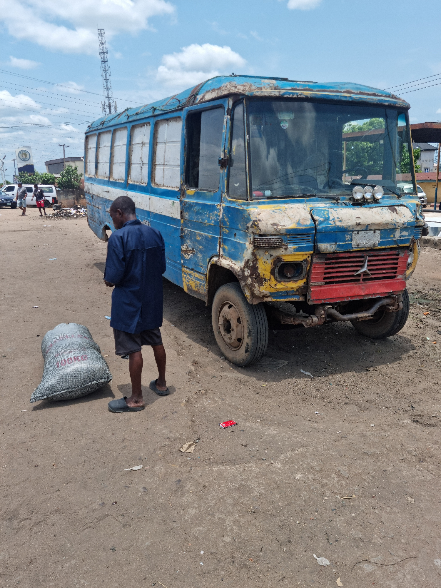 This outdoor image depicts a dilapidated, heavily rusted blue and yellow bus or truck parked on a dirt road or unpaved lot under a bright, partly cloudy daytime sky. The vehicle shows significant wear…read more
