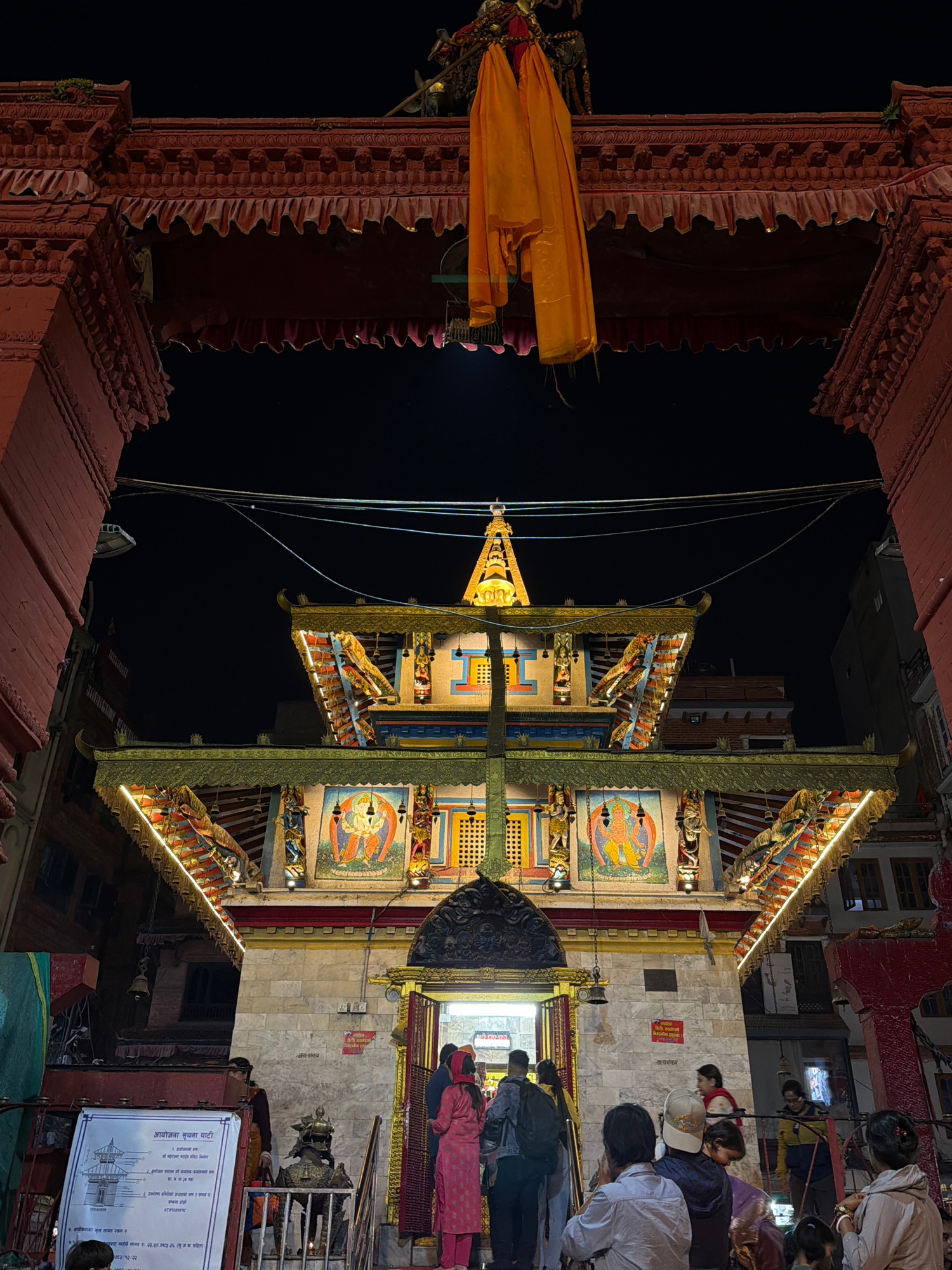 At night, a three-tiered structure is lit with gold and white lights, as people gather and pray at a temple. It appears to be located in Kathmandu Metropolitan City, Nepal. The structure has detailed…read more