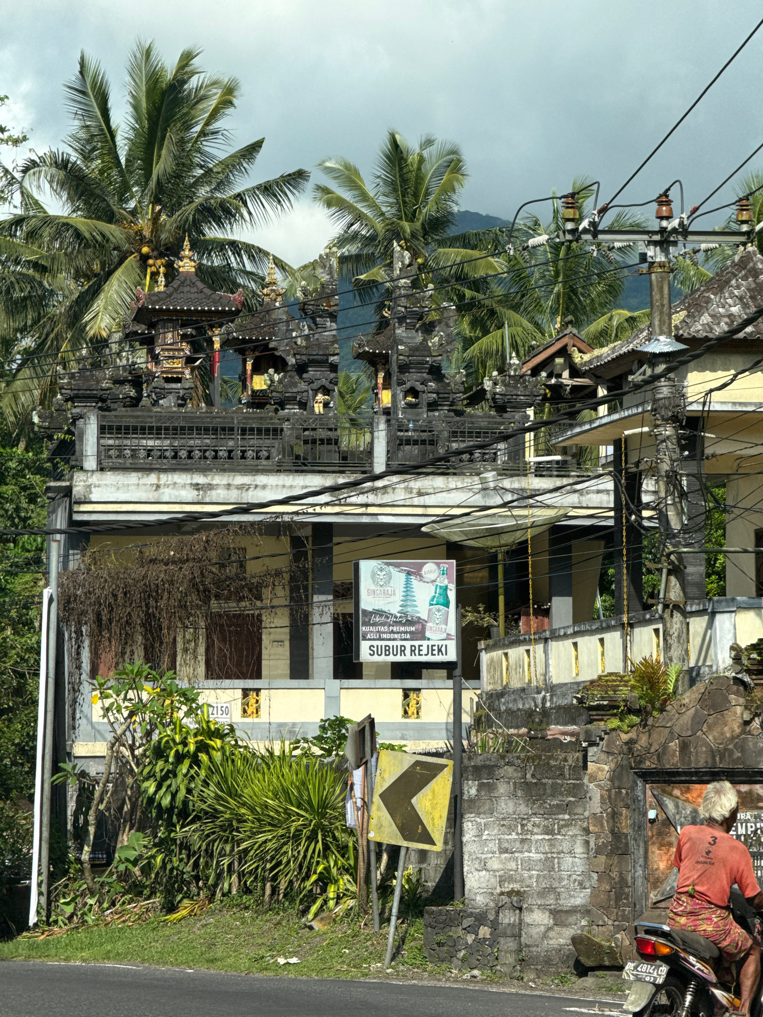 The image shows a street scene in Tista, Indonesia. On the right, a man wearing a red shirt and patterned shorts sits on a parked motorcycle next to a stone wall. A yellow and black chevron sign is po…read more