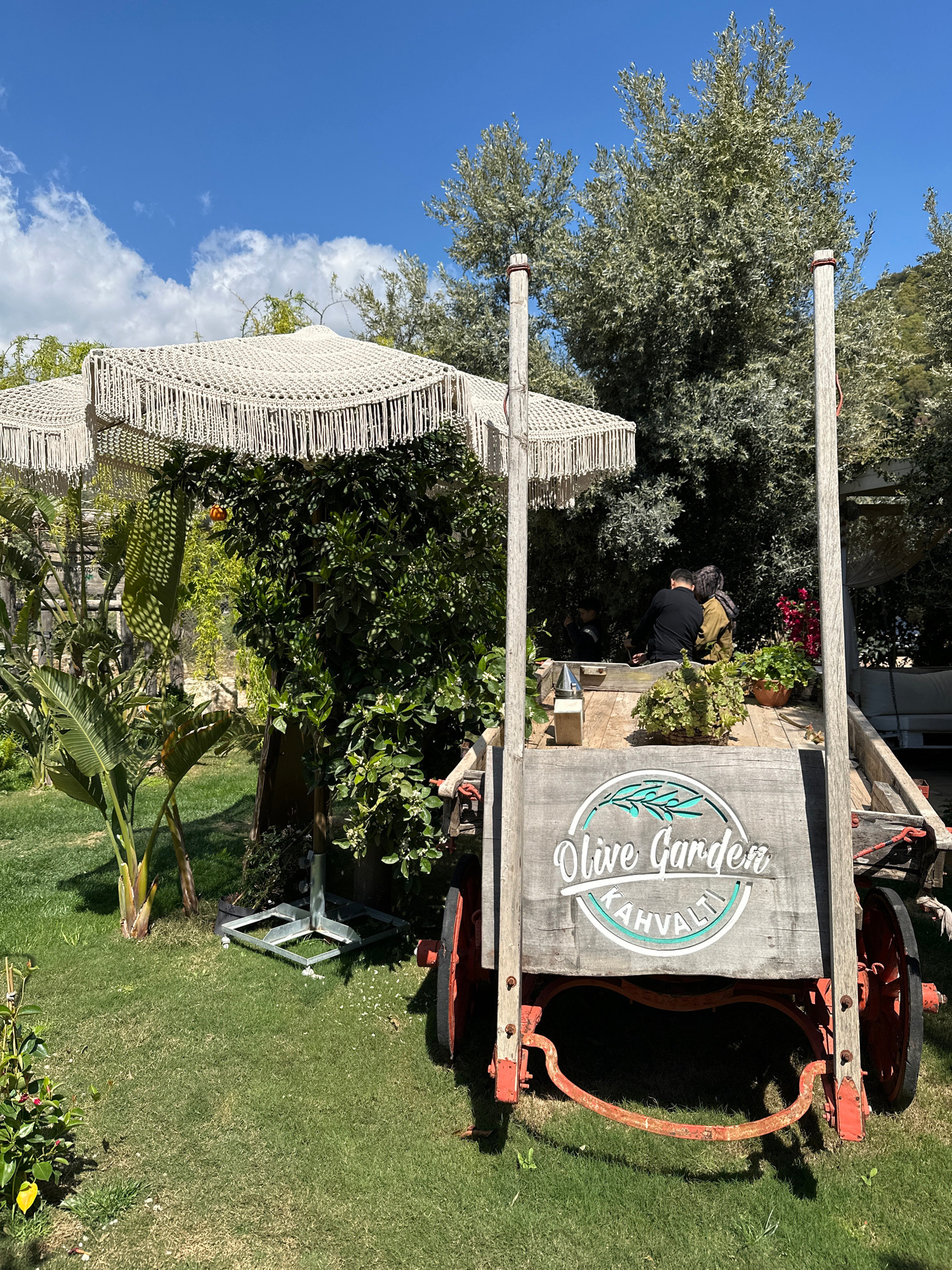 The image depicts an outdoor scene with a rustic wooden wagon featuring the sign "Olive Garden - Kahvalti" in Kaş, Turkey. The wagon is situated on a grassy area surrounded by trees and plants. The wa…read more