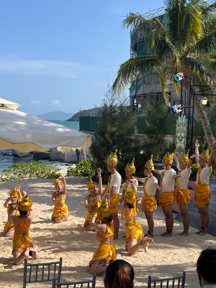 A group of performers in yellow and white traditional attire are on a beach. They wear elaborate headdresses. Their costumes feature ornate details and unique accents. The background includes a beach…read more
