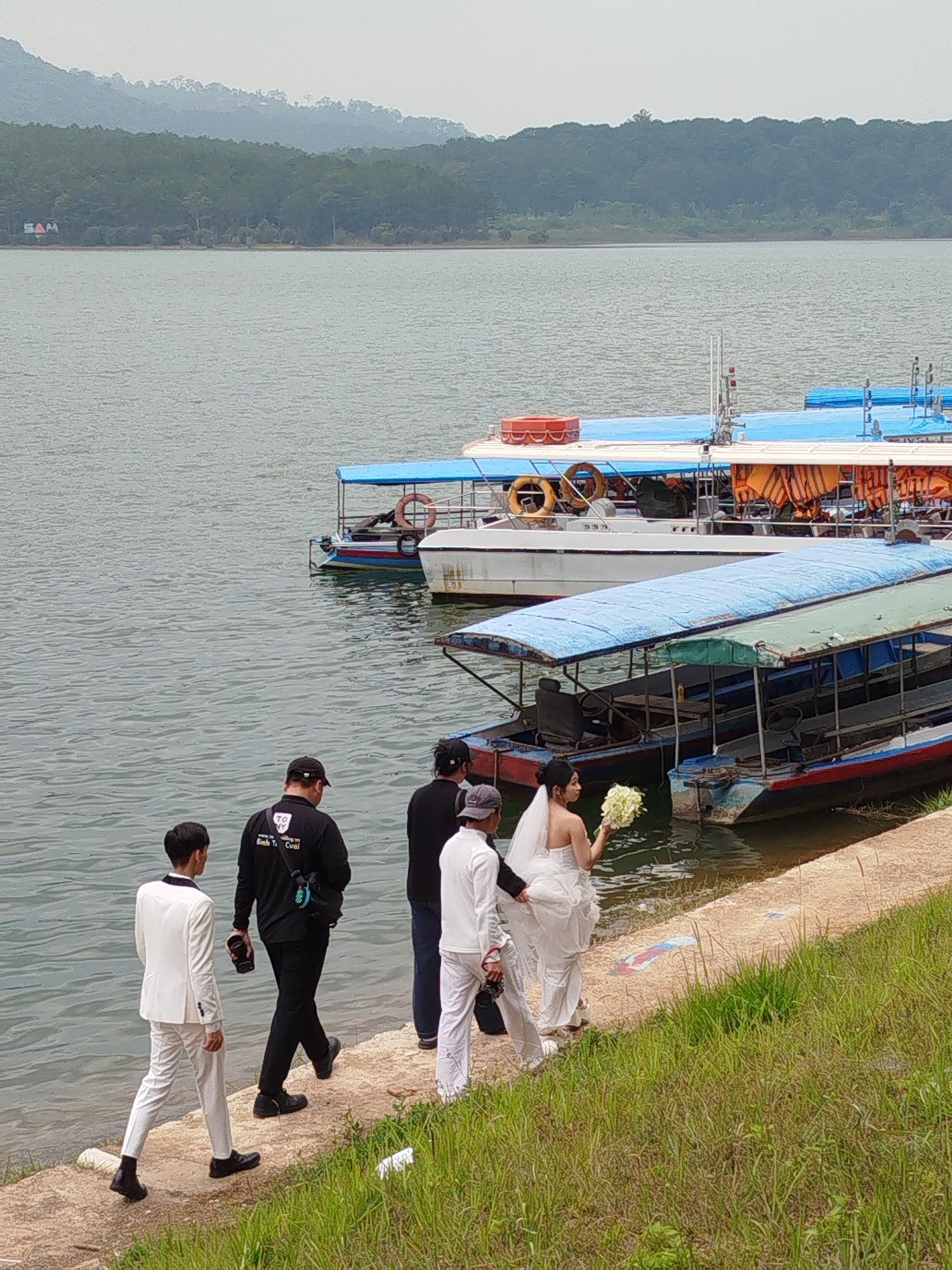 A wedding party is walking on a concrete walkway along a body of water, near docked boats. The bride is wearing a white strapless gown and veil, holding a bouquet. A man in a white suit is walking ahe…read more