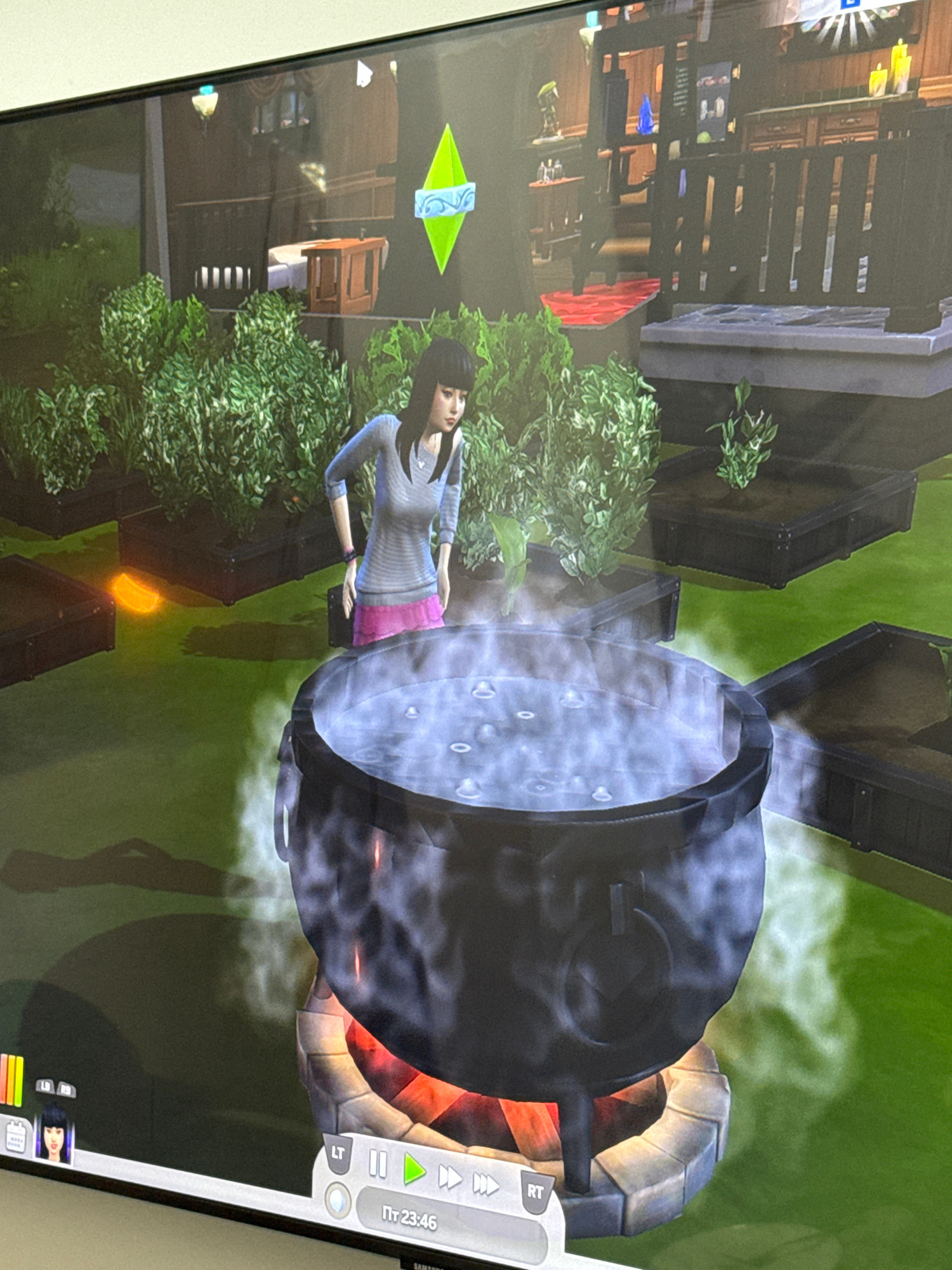 The image depicts a scene from the video game "The Sims," possibly "The Sims 4," displayed on a television screen. A female Sim character, wearing a gray top and pink pants, stands next to a large cau…read more