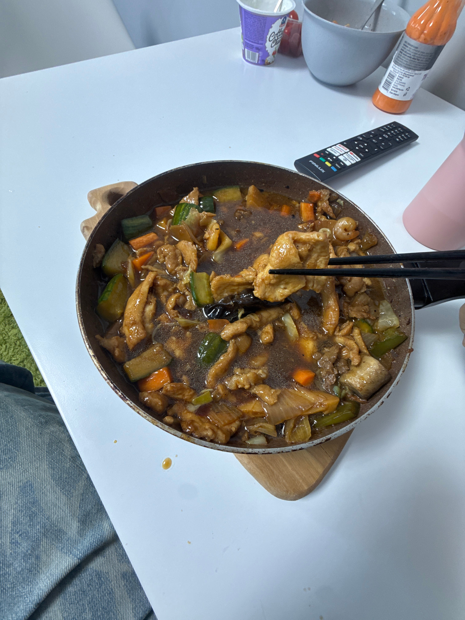 A top-down shot shows a frying pan filled with cooked food, likely a stir-fry, consisting of meat, carrots, and zucchini in a dark sauce. Chopsticks are present, holding up a portion of the food. The…read more