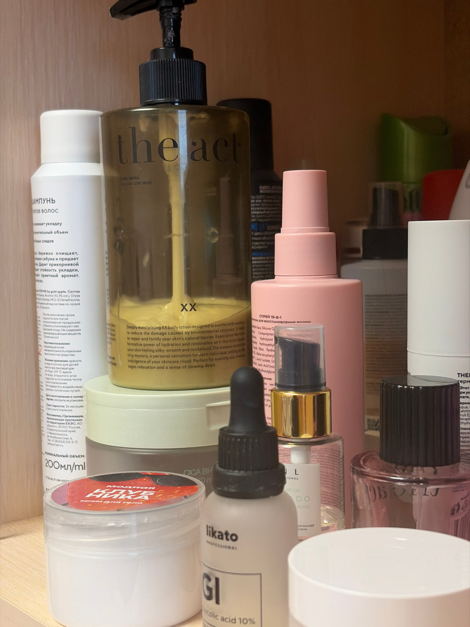 The image shows a close-up of various cosmetic and personal care products, seemingly stored together in a drawer or cabinet. Brands include "the act," "likato PROFESSIONAL," "GI glycolic acid 10%," "M…read more