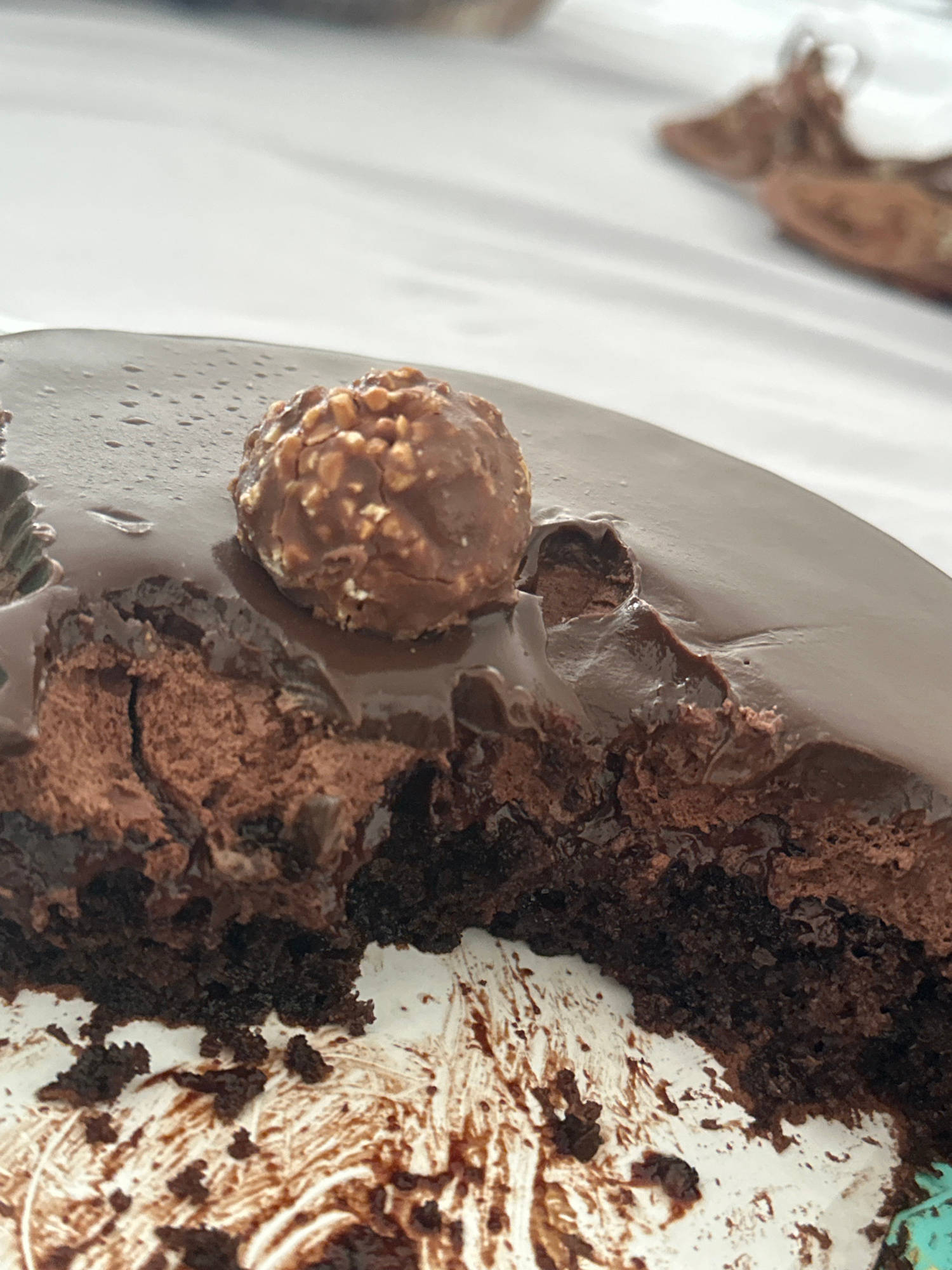 The image depicts a partially eaten chocolate cake on a white plate. A Ferrero Rocher candy is placed near the cake. The cake appears to be on a white surface, possibly a table. There is no indication…read more
