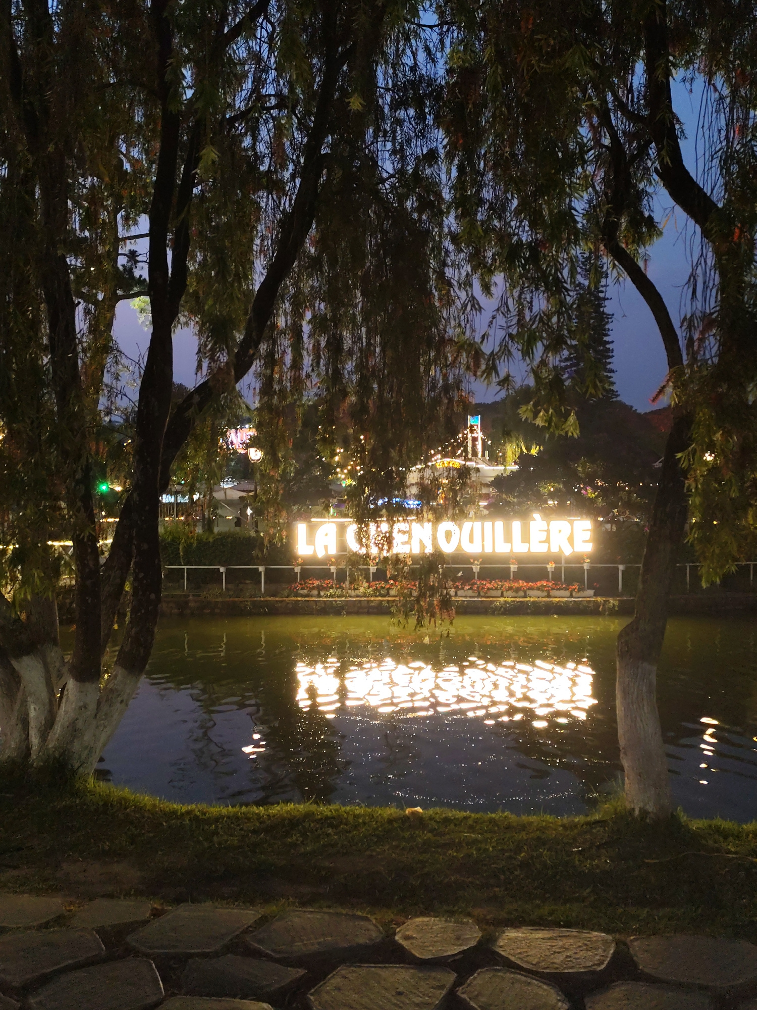 The image captures a nighttime scene at Xuan Huong Lake in Da Lat, Vietnam. A pond or lake reflects the illuminated sign "LA CRENOUILLERE" prominently displayed on the opposite bank. Trees with peelin…read more