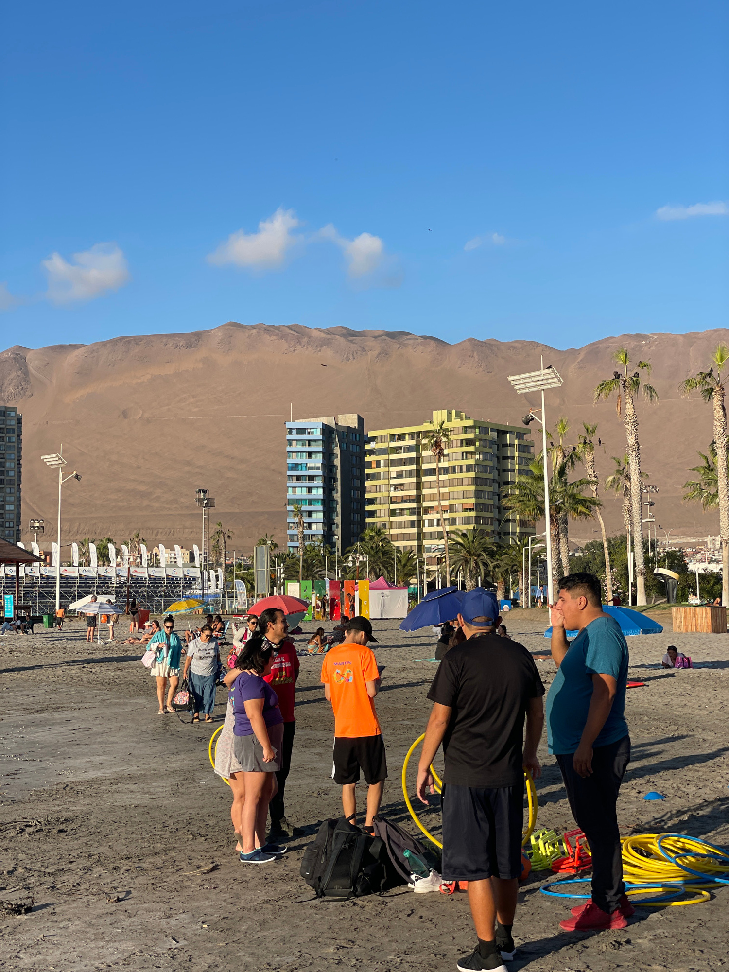 This image, when viewed horizontally, depicts a lively, sunny day at a beach in Iquique, Chile, with a striking desert mountain landscape in the background. In the foreground, several people are engaβ¦read more