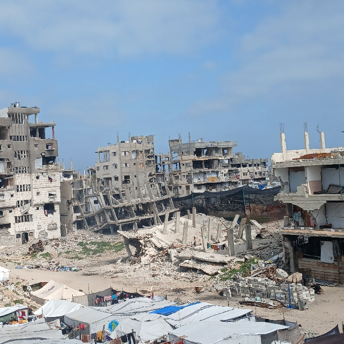 The image depicts a severely damaged urban landscape in the city of Gaza, Palestinian Territory, under a partly cloudy sky. The scene is dominated by numerous multi-story concrete buildings, most appe…read more