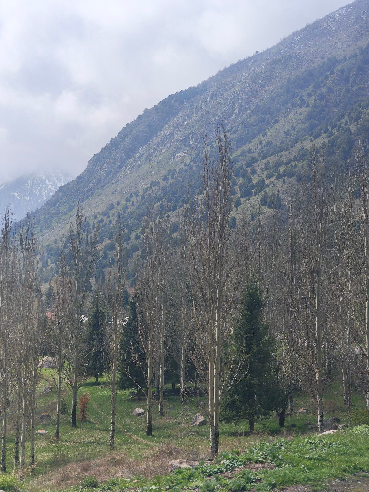 The image depicts a mountainous landscape in Kashka Suu, Kyrgyzstan. In the foreground, a sparse forest consists of tall, slender, leafless trees intermixed with a few green conifers. The ground is co…read more
