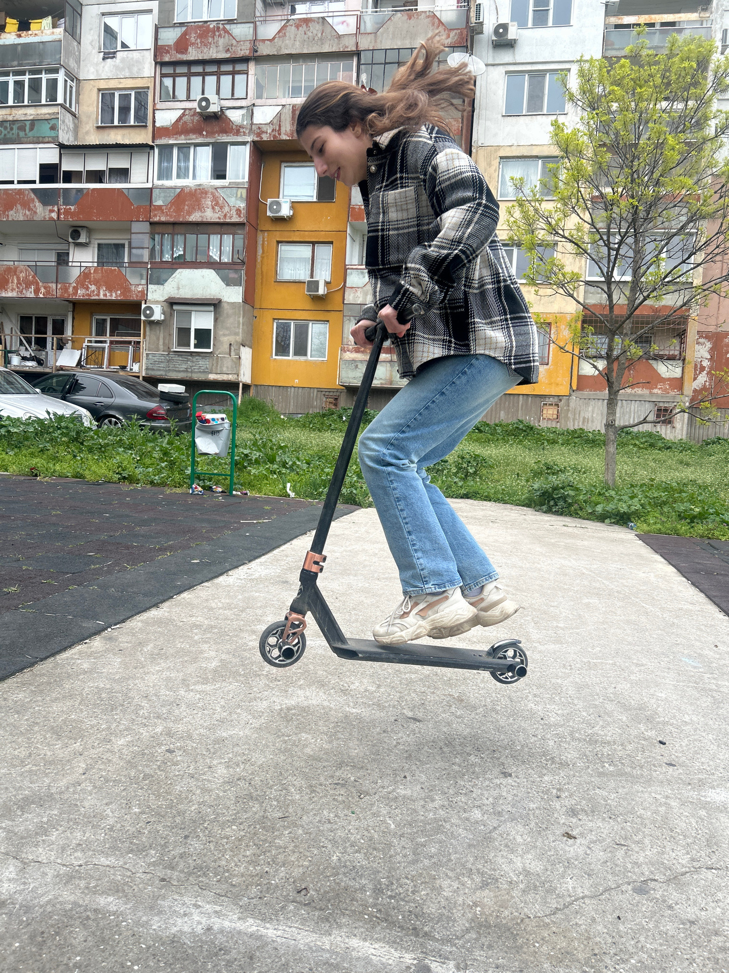 A young person is riding a black scooter on a paved surface. The individual is wearing jeans, light-colored sneakers, and a plaid jacket. In the background are apartment buildings, some with visible air conditioning units, and a small tree. A green metal structure, possibly a bike rack or support, is also visible near a parked car. The image appears to have been taken in an urban setting within Ruse, Bulgaria. The location is indicated by the architectural style of the buildings. | Open Wire