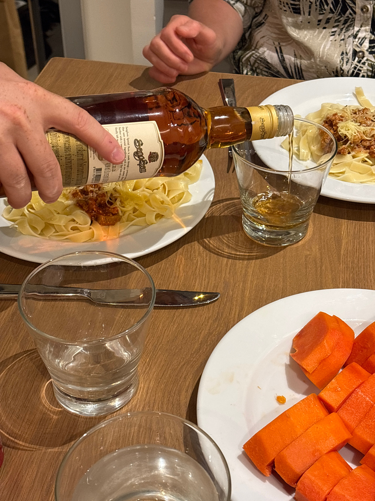 Here's a detailed description of the image: **Scene:** The scene appears to be a dining table setting, likely indoors, with food and drink. The photo is taken from an overhead perspective. **People:…read more