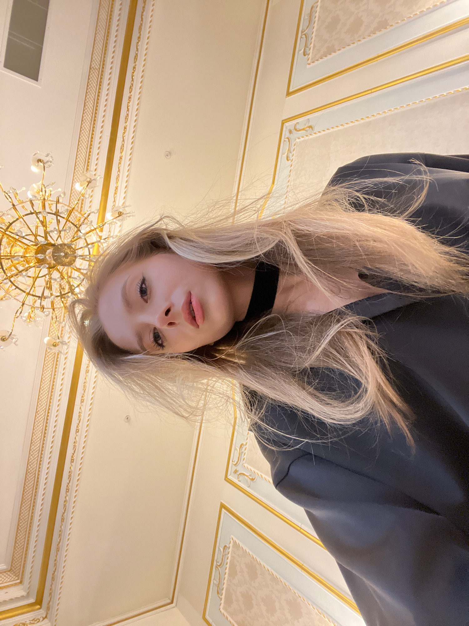 A woman with long blonde hair and wearing a black choker and dark blazer is centered in the photo, which is taken from a low angle and is upside down. She is looking directly at the camera. Behind herβ¦read more