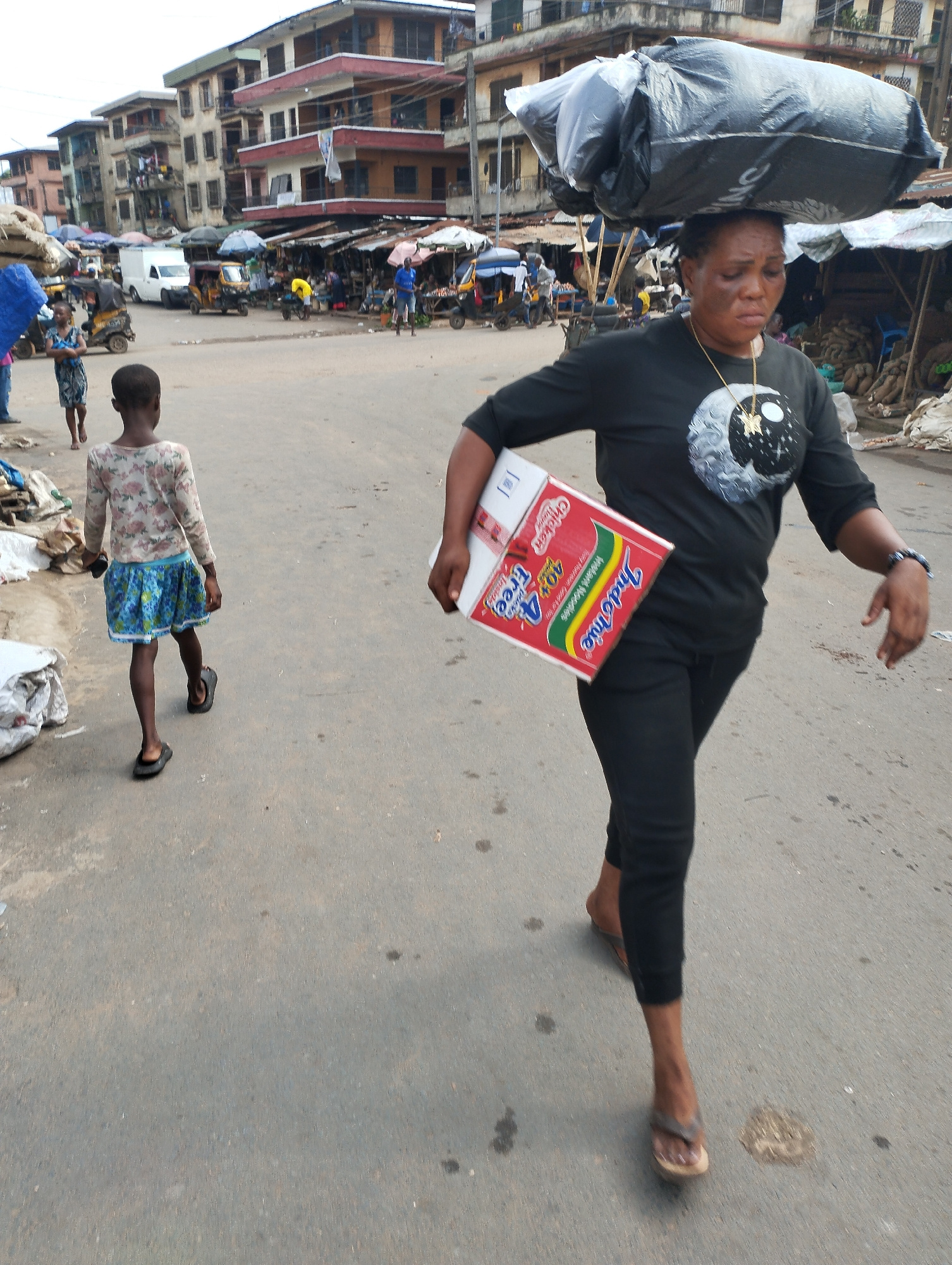 The image captures a street scene in Fegge, Nigeria. In the foreground, a dark-skinned woman is walking towards the camera, balancing a large, black bag on her head. She is wearing a black long-sleeveโฆread more
