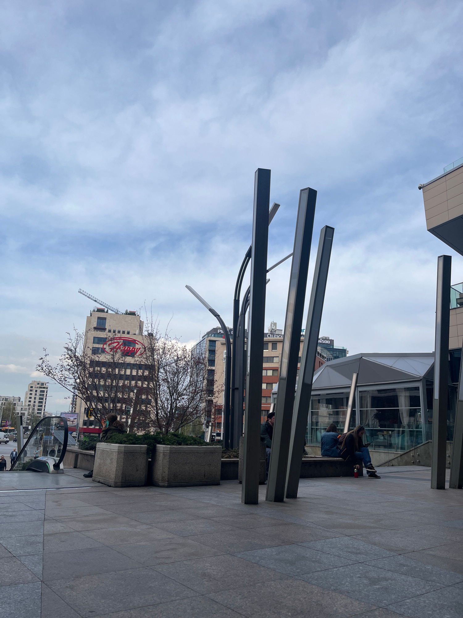 This image captures an urban outdoor scene characterized by modern architecture, likely a commercial or public area. The ground is paved with light-colored square tiles. In the foreground, several pr…read more