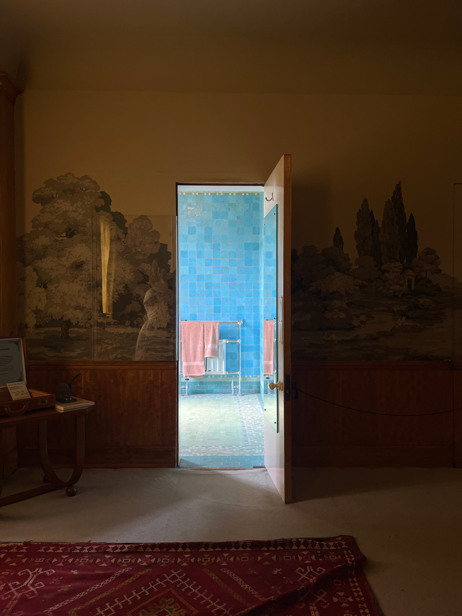 A low-angle shot of a room with a doorway that reveals a bathroom. The room has dark tan walls and a wall covering of a grey landscape on the lower half and above the door. The door is a light wood. T…read more