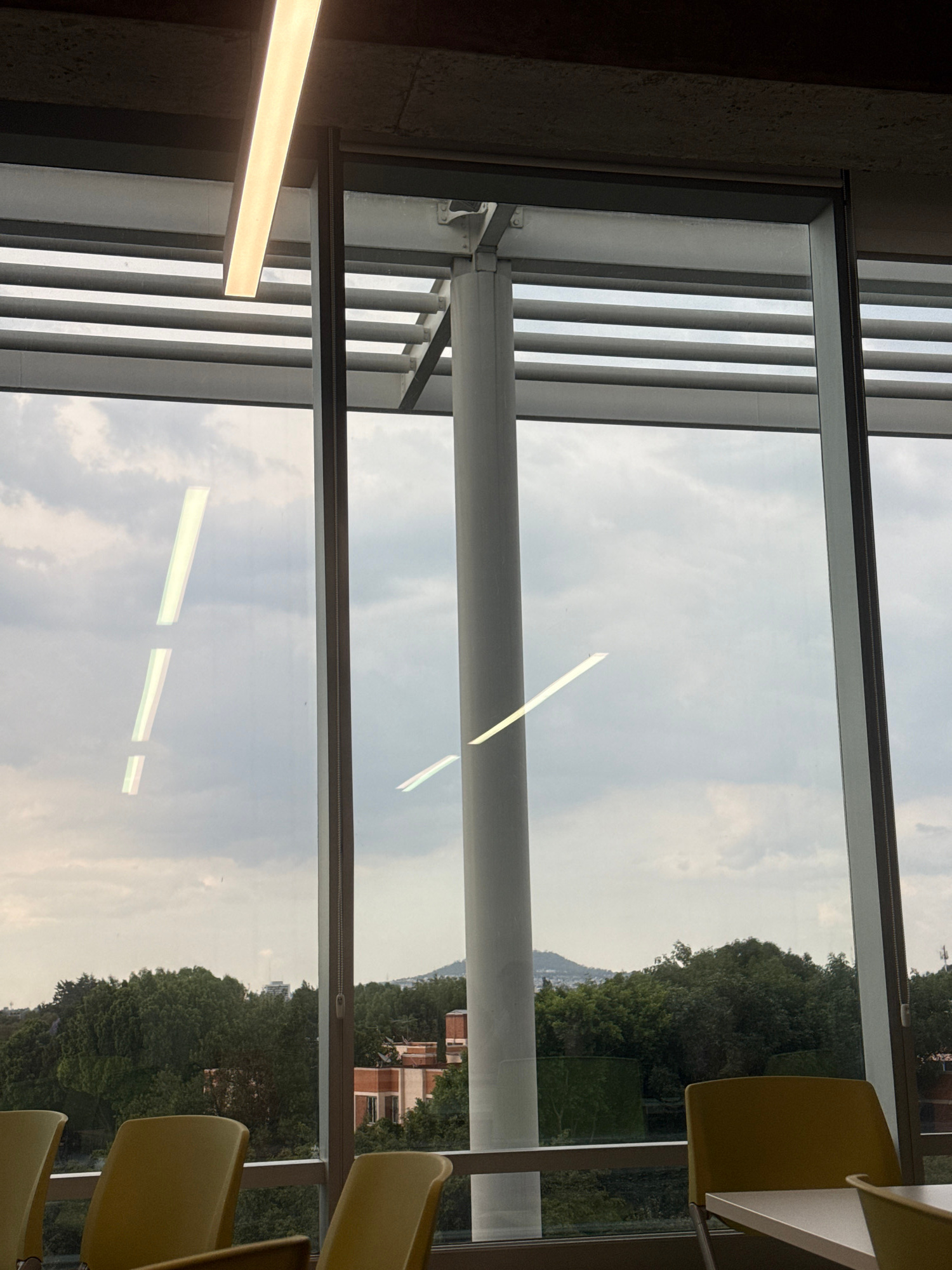 The image shows a view through a window with horizontal blinds, likely in a building, possibly a cafeteria or study area, as suggested by the presence of yellow chairs and a table. Outside, trees and…read more