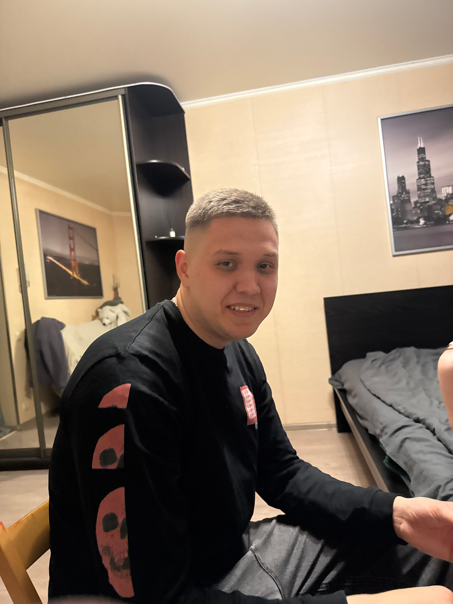 A man with short, graying hair is facing the camera and smiling slightly. He is wearing a black long-sleeved shirt with what appears to be a decorative pattern in reddish-pink on the sleeves. Behind…read more