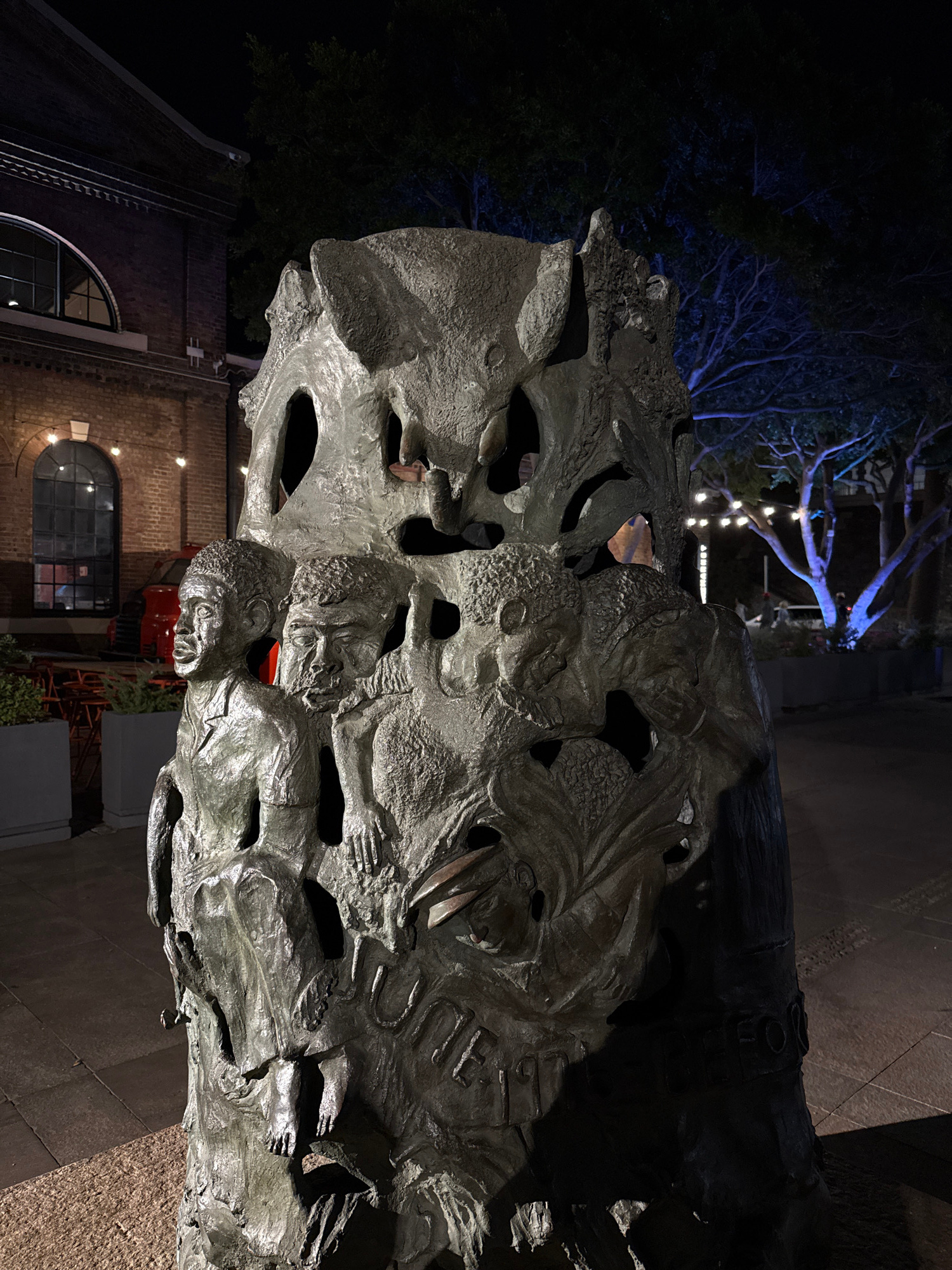 The image shows a sculpture made of what appears to be metal, featuring carved or molded figures. It is situated outdoors at night. In the background, there is a building with a visible arched window…read more