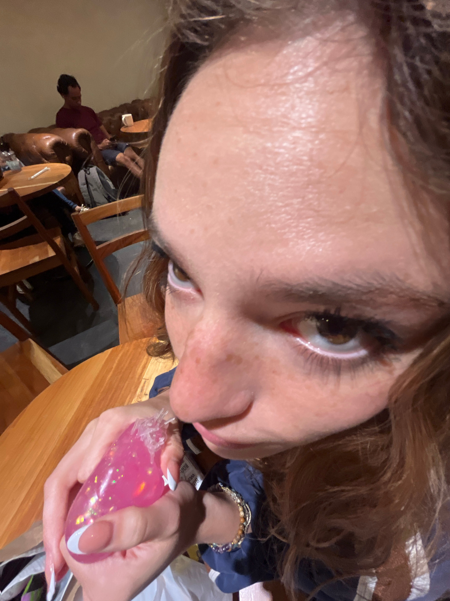 A close-up angled shot shows a woman with light skin, brown hair, and freckles. She is holding a clear plastic bag filled with a pink liquid with sparkles. Her left hand is visible with long, painted…read more