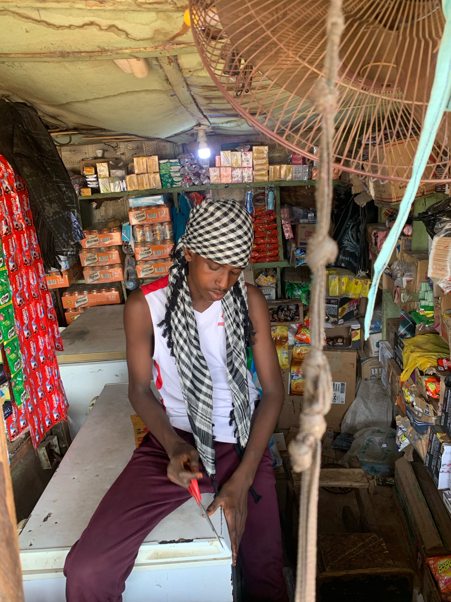 A man is sitting in a small, cluttered shop in Lokoja, Nigeria, surrounded by various items for sale. The man is wearing a white and red shirt, maroon pants, and a black and white checkered headscarf.…read more