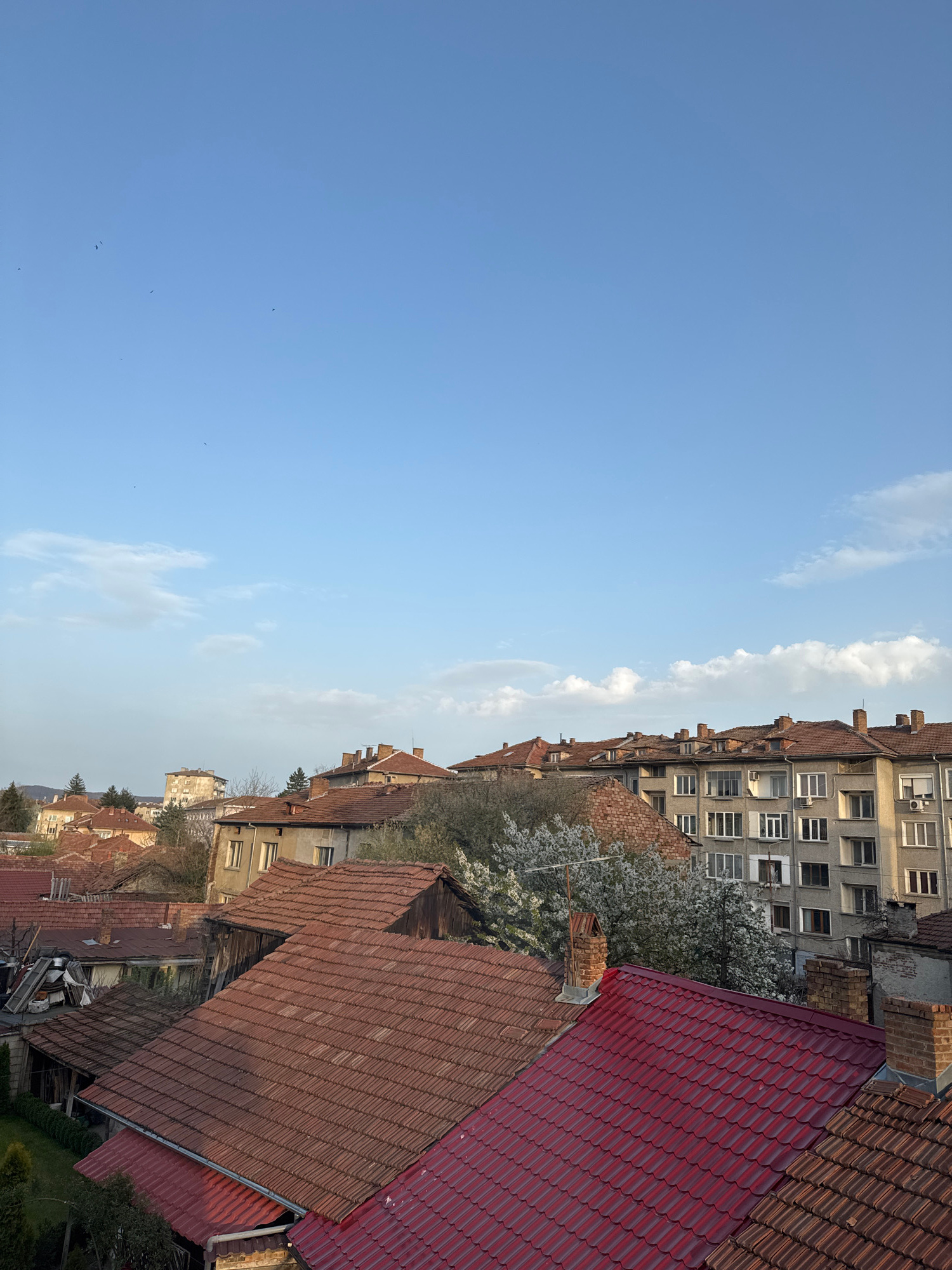 The image presents a view of rooftops and buildings, presumably in an urban setting. The perspective is from an elevated position, looking down on the scene. The composition is divided between a blue…read more
