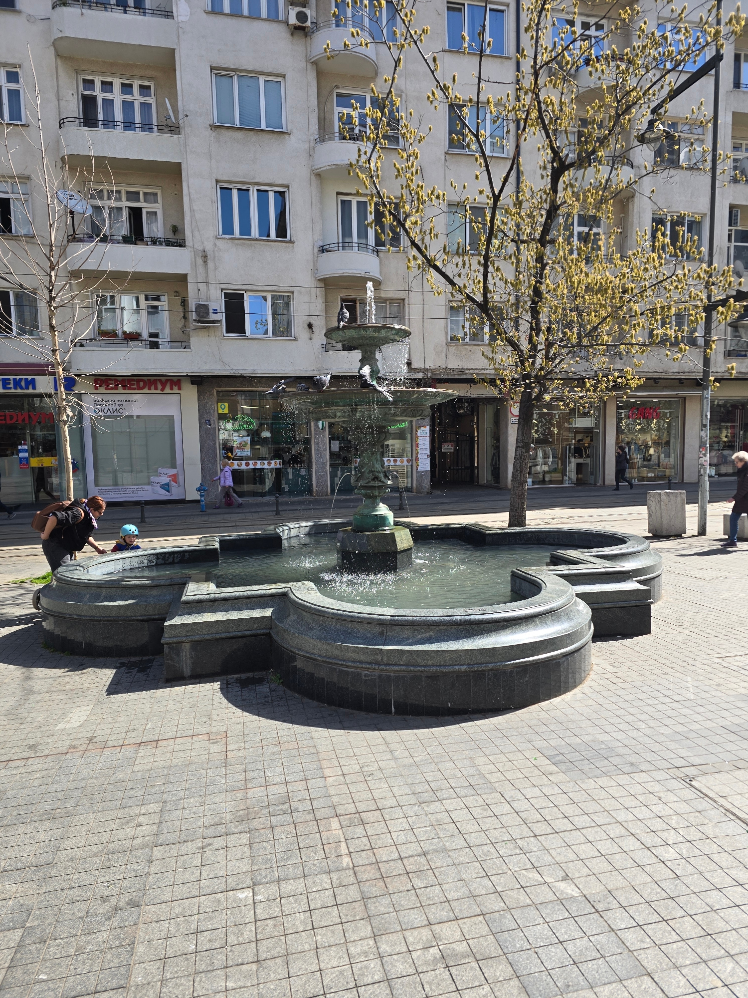 An outdoor urban scene in Sofia, Bulgaria, is depicted on a bright, sunny day during early spring. The photograph is centered on a prominent, multi-tiered stone fountain with water actively flowing. T…read more