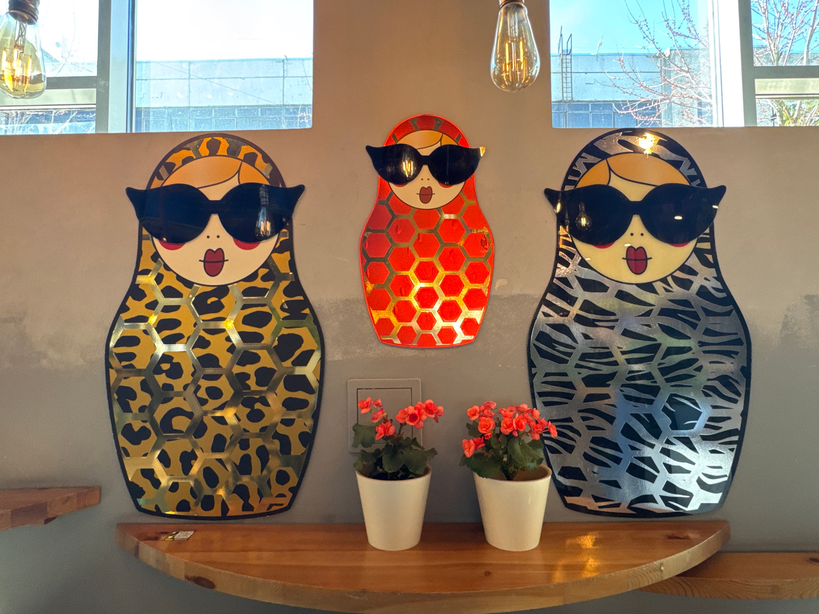 The image displays a brightly lit interior wall featuring three stylized Matryoshka doll-shaped wall hangings and two potted plants on a wooden shelf. The wall is light gray. The three decorative dol…read more