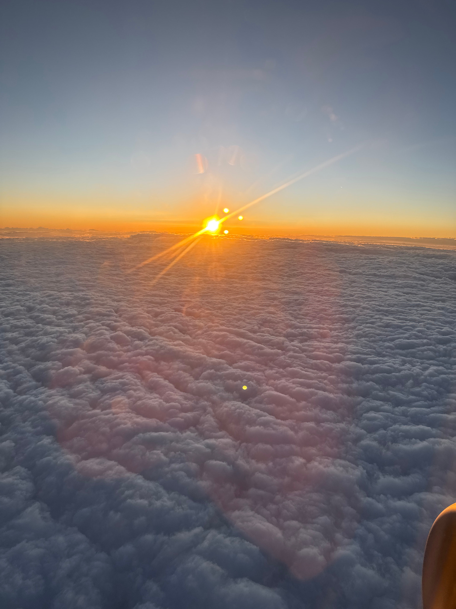 The image shows a sunrise or sunset viewed from above the clouds. The sun is positioned on the left, emitting bright rays, and the sky transitions from blue to orange near the horizon. A vast expanse…read more