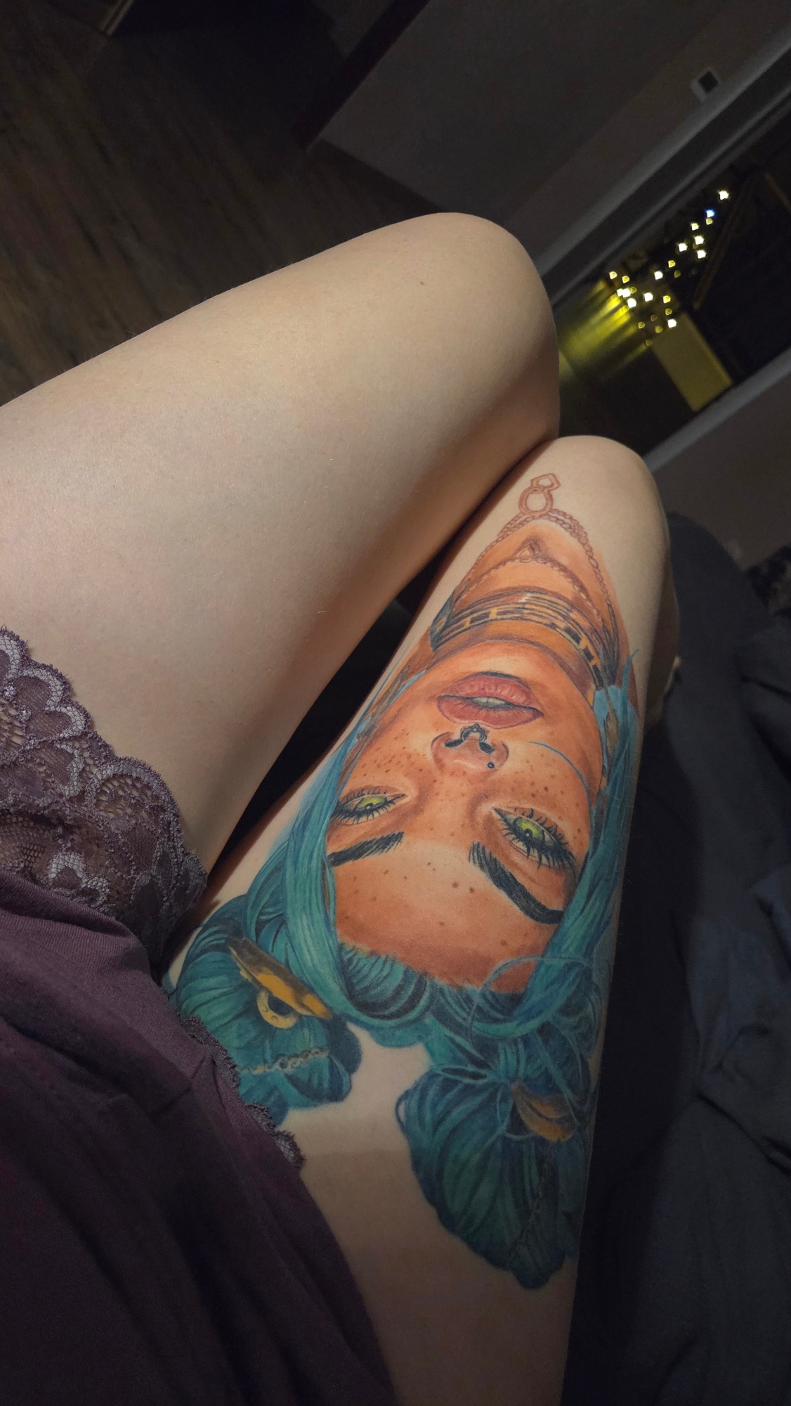 The image shows a person's leg with a detailed tattoo of a woman's face with blue hair and a nose ring. The person is wearing a dark purple shirt or dress with lace detailing. In the background, there…read more