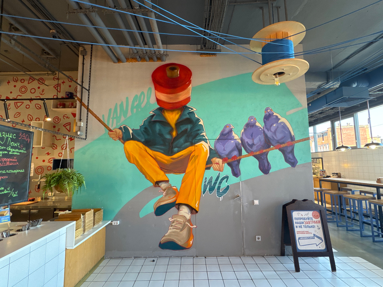 The image captures the interior of a vibrant, contemporary cafe or restaurant in Saint Petersburg, Russia, characterized by a large, colorful mural and industrial-themed decor. The central feature is…read more