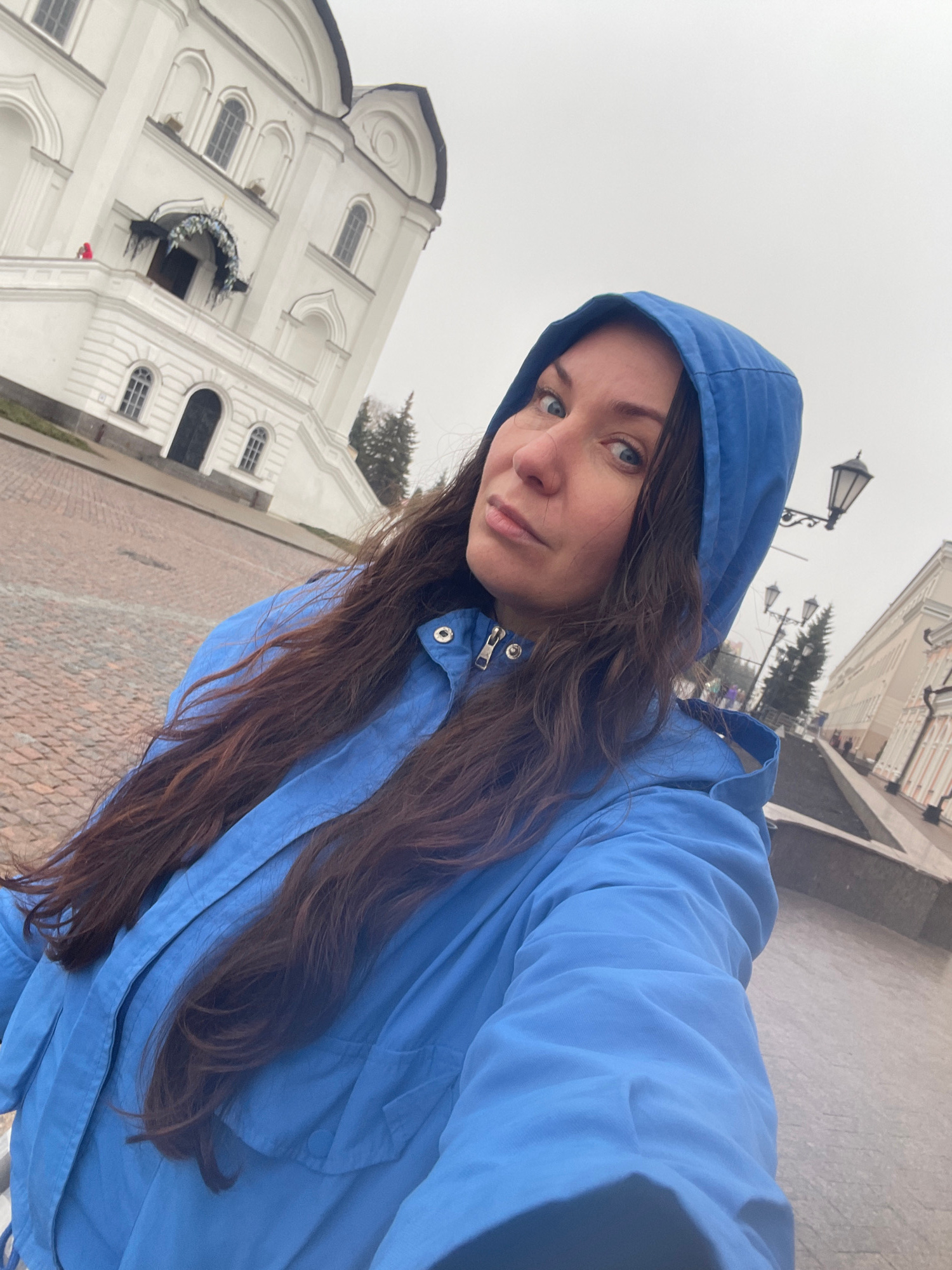 A woman wearing a blue hooded jacket poses for a selfie in Kazan, Russia. In the background, a white multi-story building with arched windows and decorative wreaths above its entrances is visible to t…read more