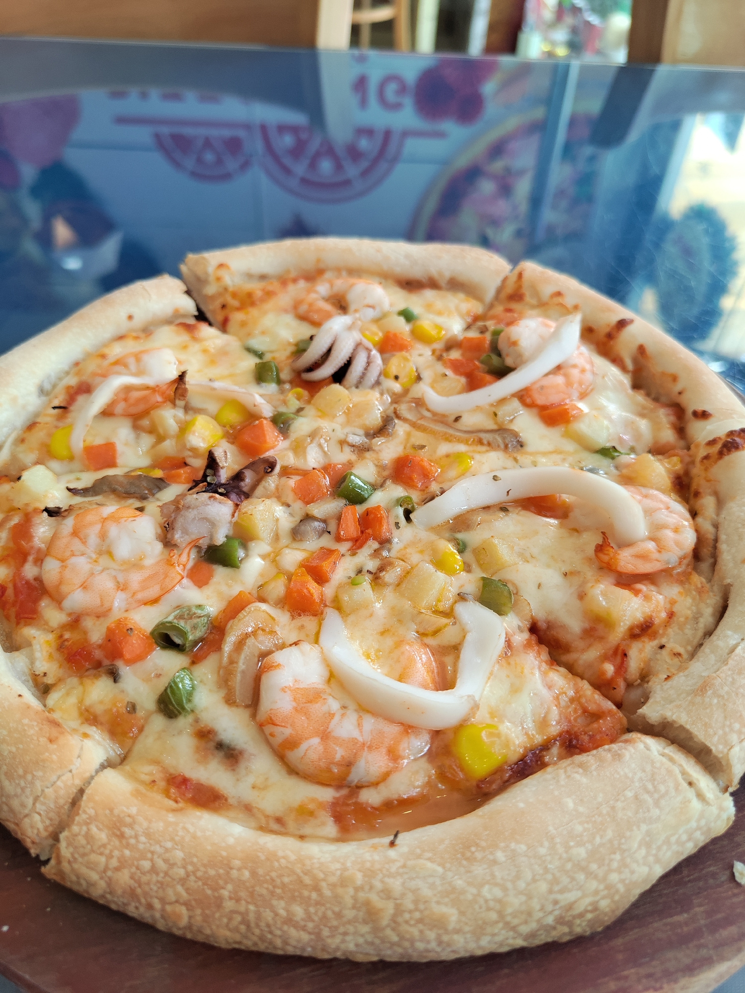 The image shows a seafood pizza on a wooden board. The pizza is topped with shrimp, squid rings, corn, diced carrots, pineapple, green beans, and cheese. The crust is thick and golden brown. The pizza…read more