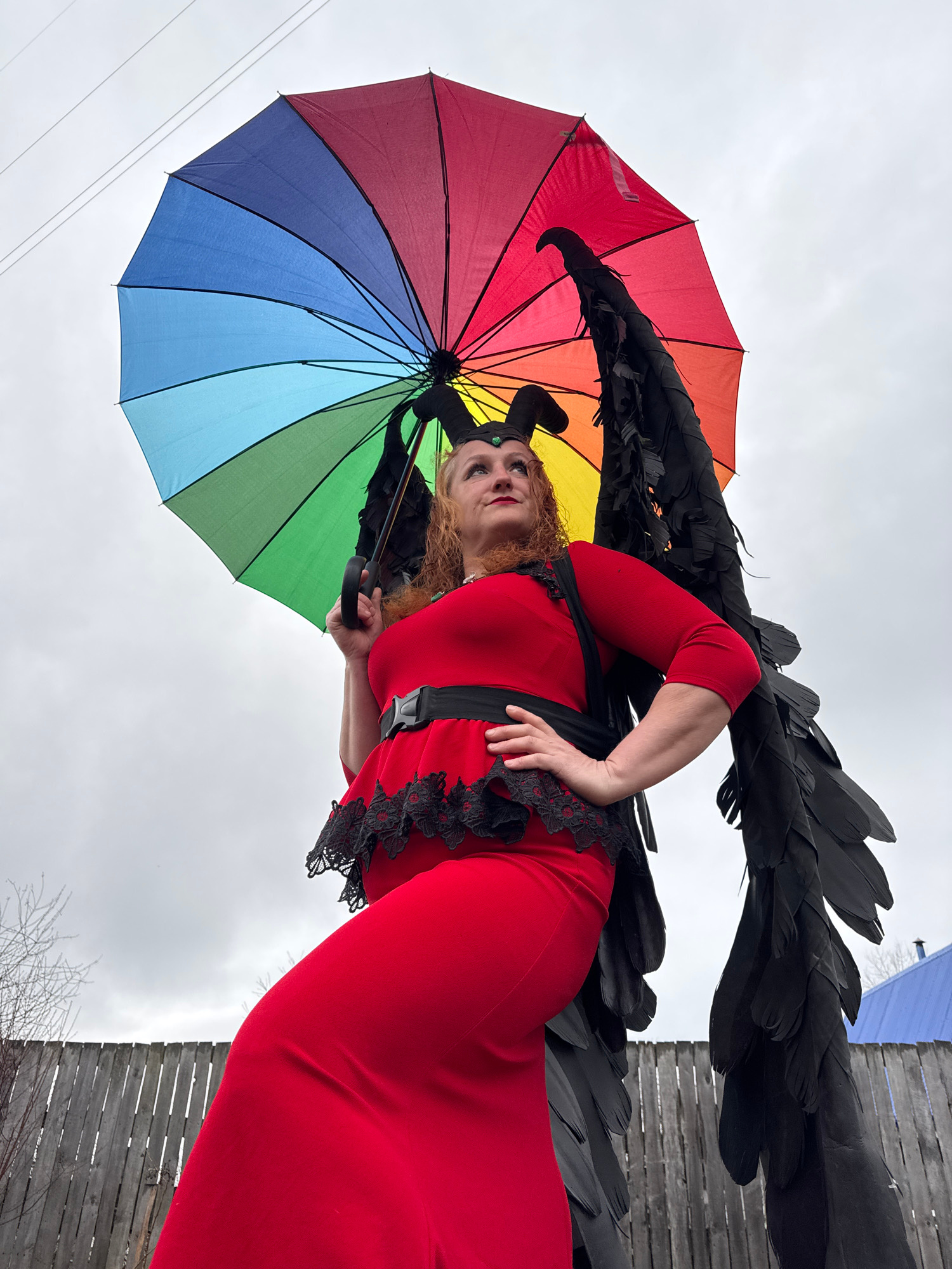 The image shows a woman dressed in a red dress with black lace and feathered black wings. She is holding a rainbow-colored umbrella and wearing horns on her head. She appears to be at an outdoor locat…read more