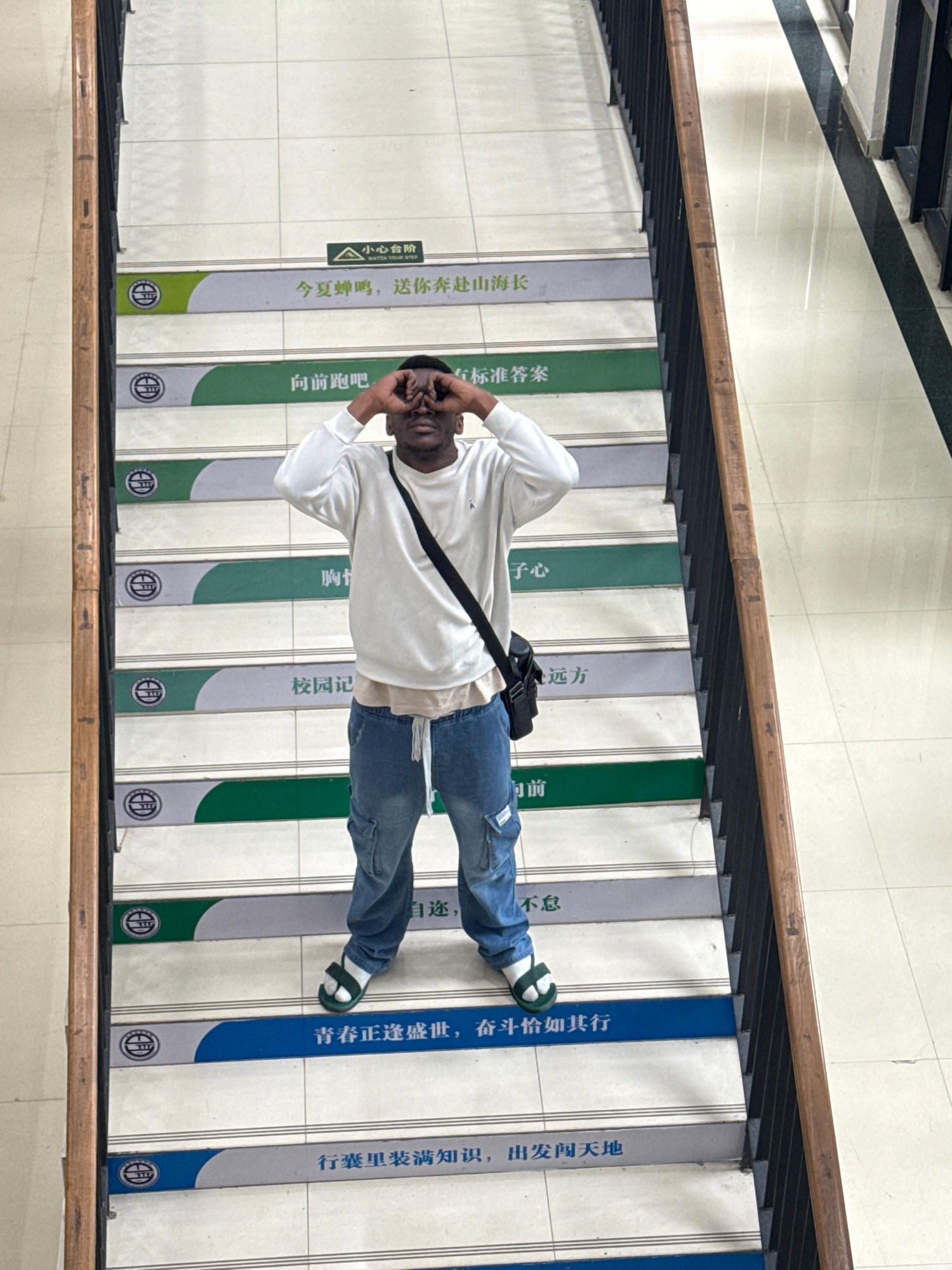 A man is lying on a staircase, seemingly in distress or deep thought. He is Black, wearing a white long-sleeved shirt, blue jeans, and green and white slides. He is facing the camera and has his hands…read more
