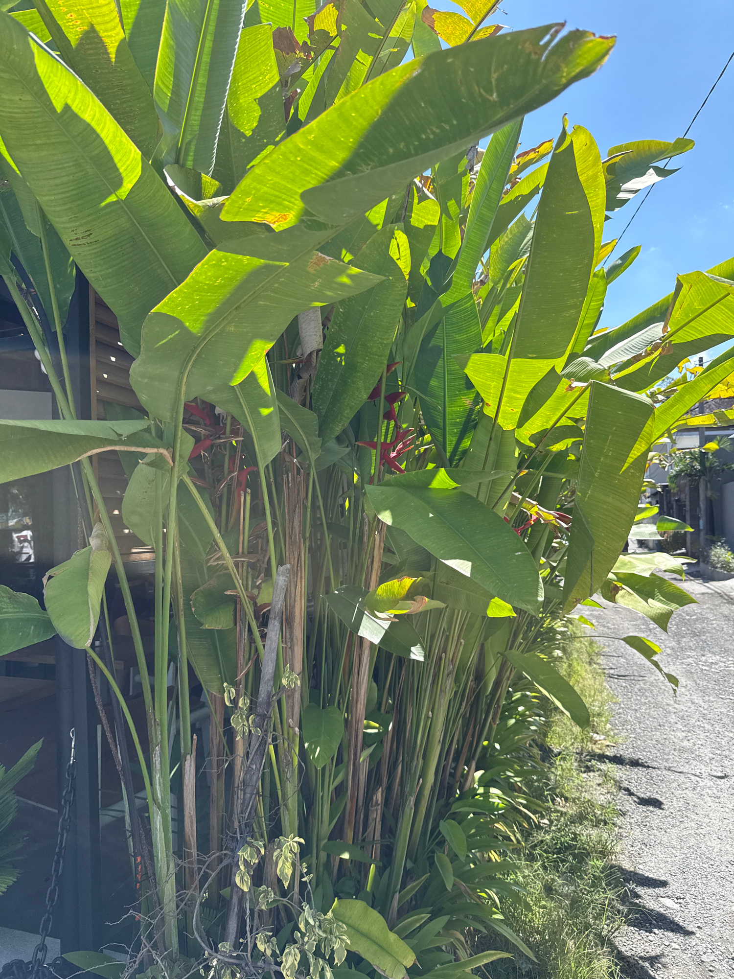 The image shows lush green foliage with large, banana-like leaves, likely of tropical plants, under a bright sky. Some red flowers are visible amongst the leaves. The plants appear to be growing on a…read more