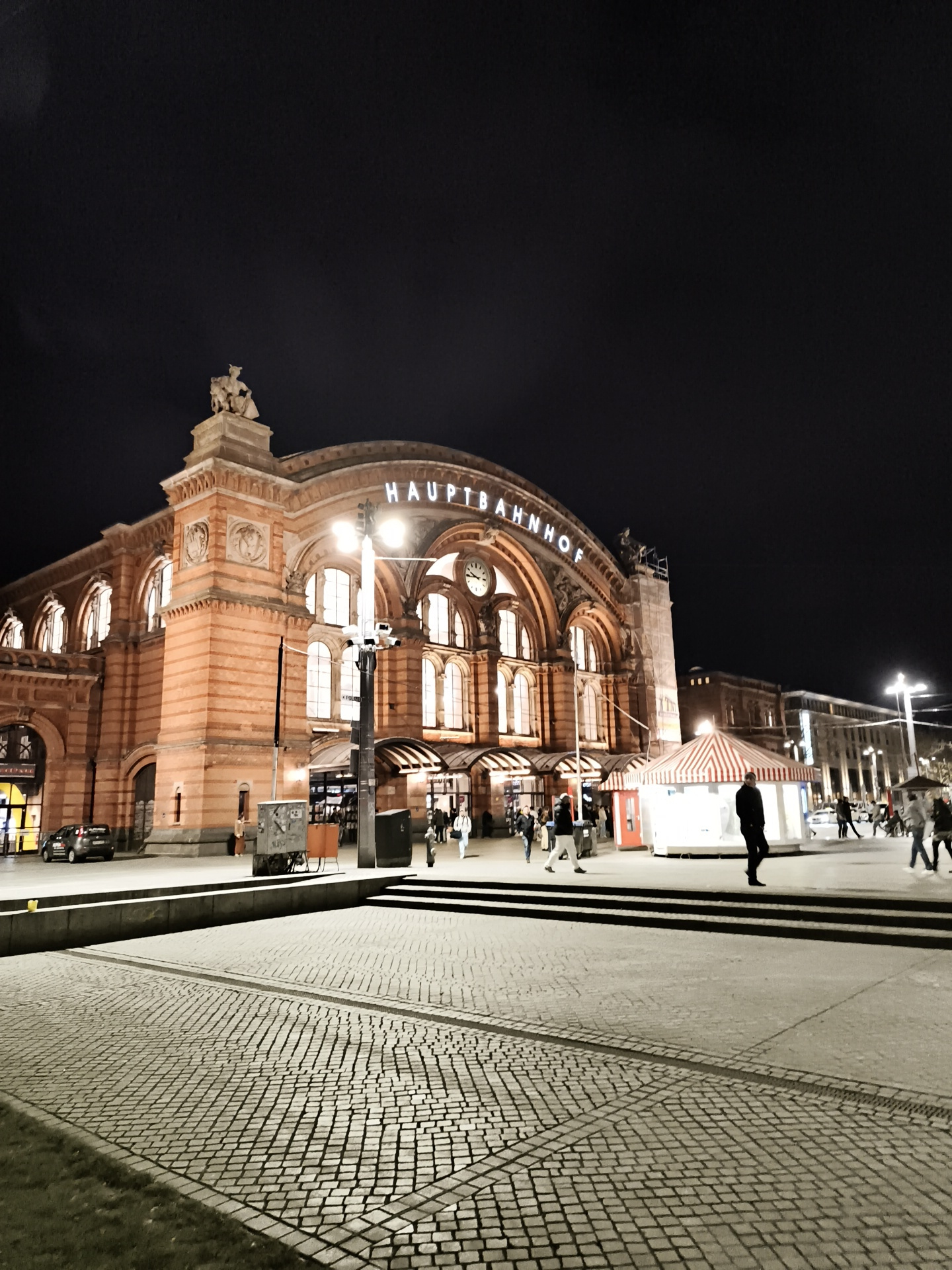 The image depicts the Hauptbahnhof (main train station) in Stadtgebiet Bremen, Germany, at night. The station building is illuminated, revealing its ornate brick facade, arched windows, and the word "…read more