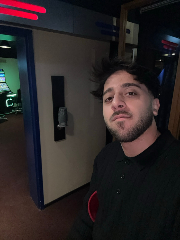A person with dark hair and a beard is facing the camera. They are wearing a dark button-up shirt. Behind the person is a wall with a black rectangle and a metallic object mounted on it. Red verticalβ¦read more