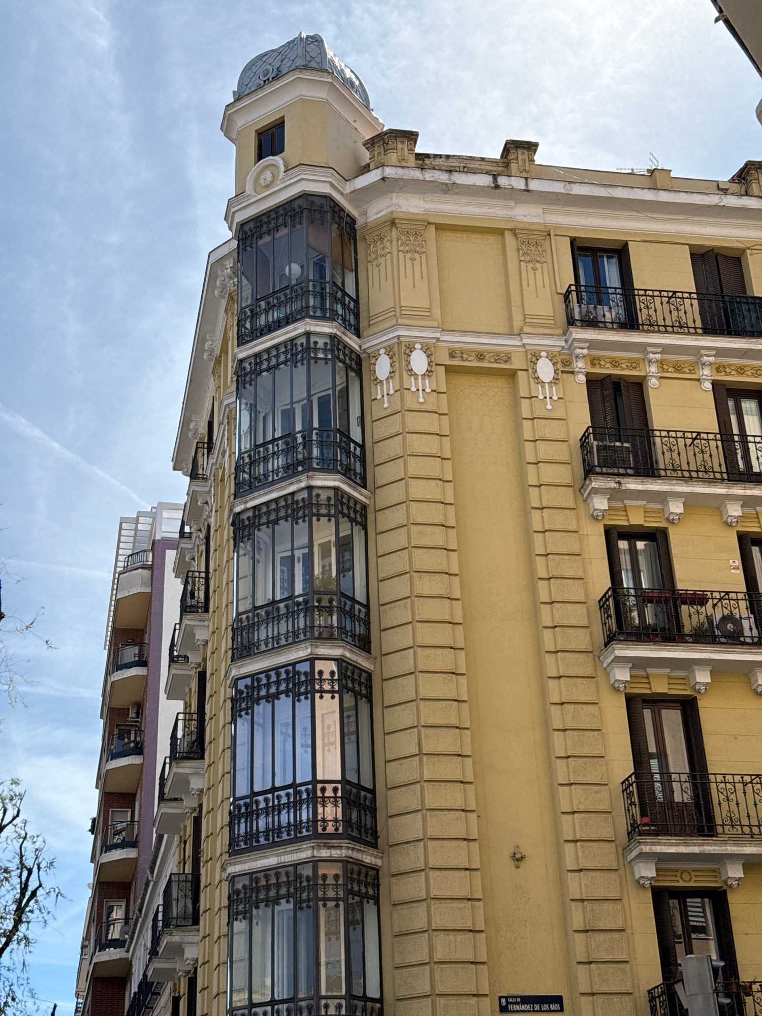 A low-angle, medium shot depicts the corner of a multi-story, tan building in Madrid, Spain. The building features multiple windows with ornate iron balconies. The building's architectural style inclu…read more