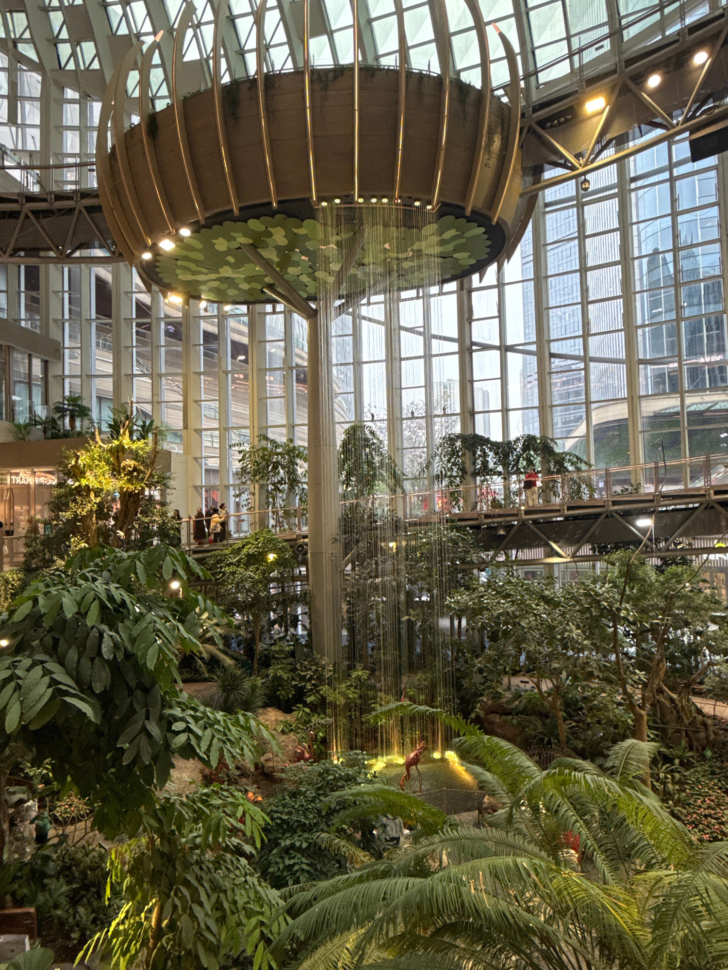 This image captures a multi-story indoor atrium or conservatory located in Liangjiang, China. The expansive space features a high glass and metal-framed ceiling and walls, allowing views of external u…read more