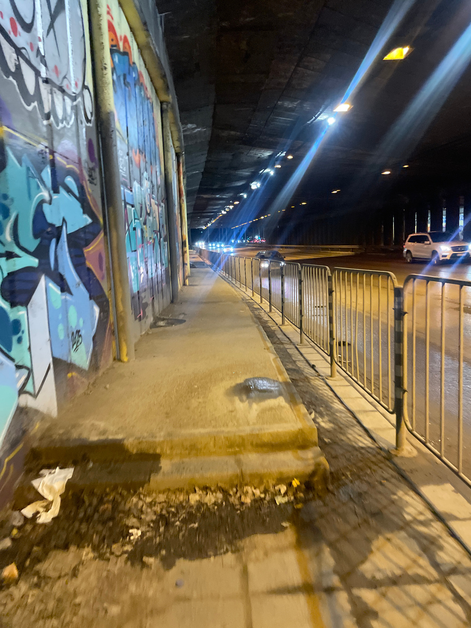 Captured from a low angle, the photograph depicts a section of the underpass beneath Sofia University in Sofia, Bulgaria. The right side of the image features a worn, concrete wall with water stains a…read more