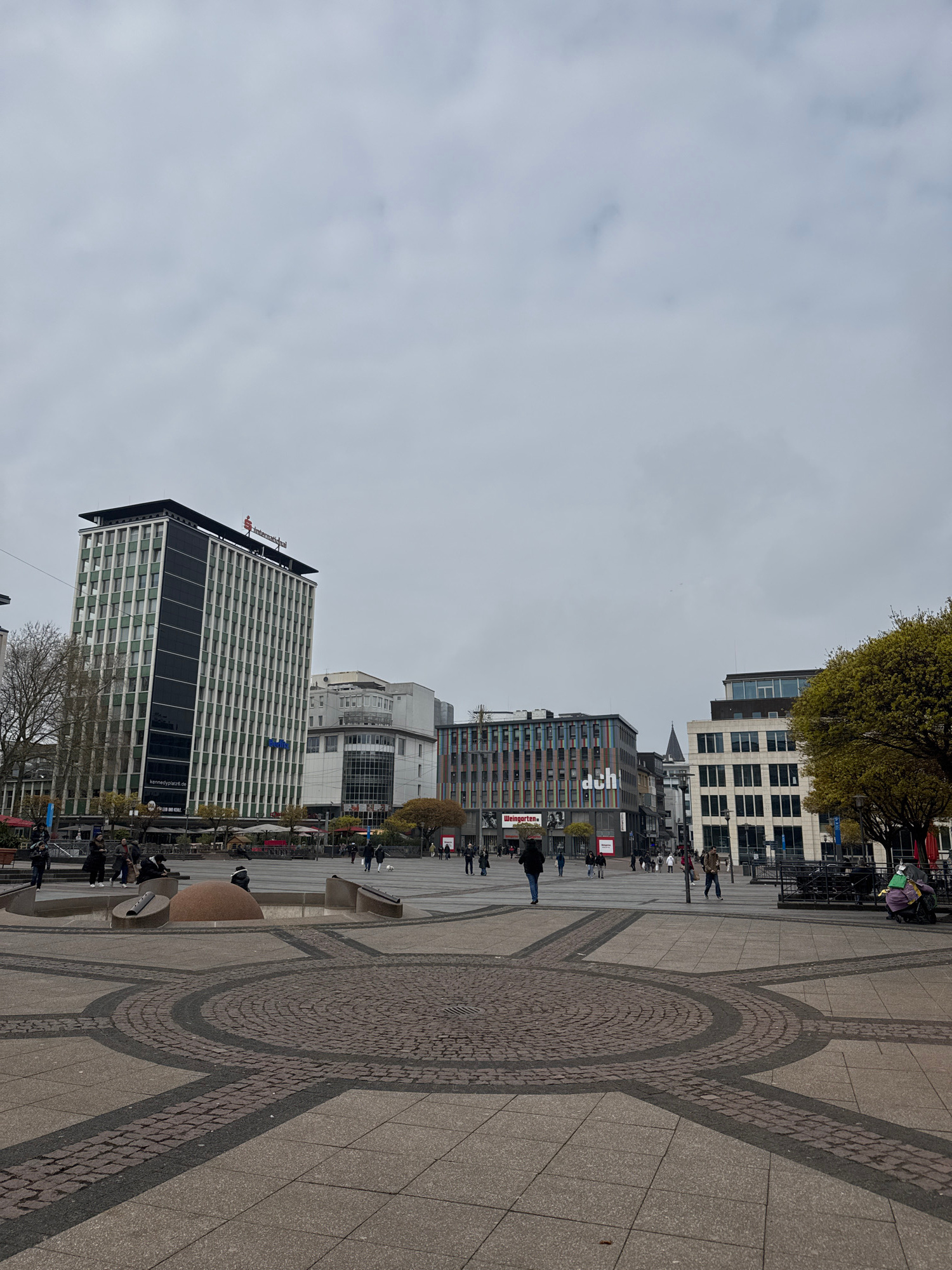 This image captures a wide-angle view of a public square in Essen, Germany, characterized by a gray overcast sky. The perspective appears to be from ground level, likely taken by a pedestrian. Buildi…read more