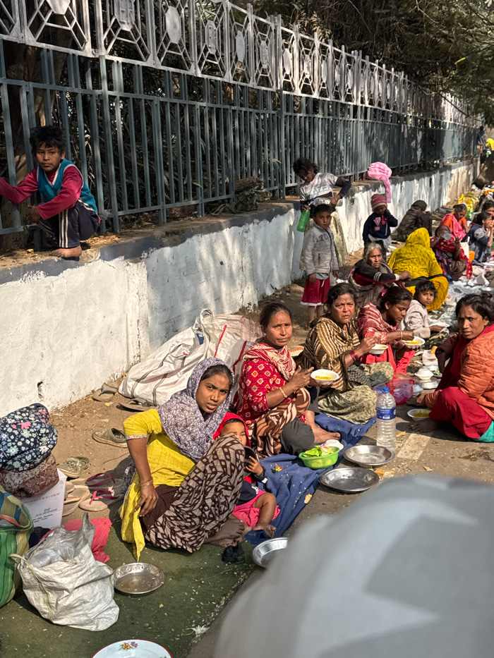 A group of women and children are lying on the ground beside a painted white wall. They are holding plates of food and some are eating. A metal grate runs along the other side of the wall. A child is…read more