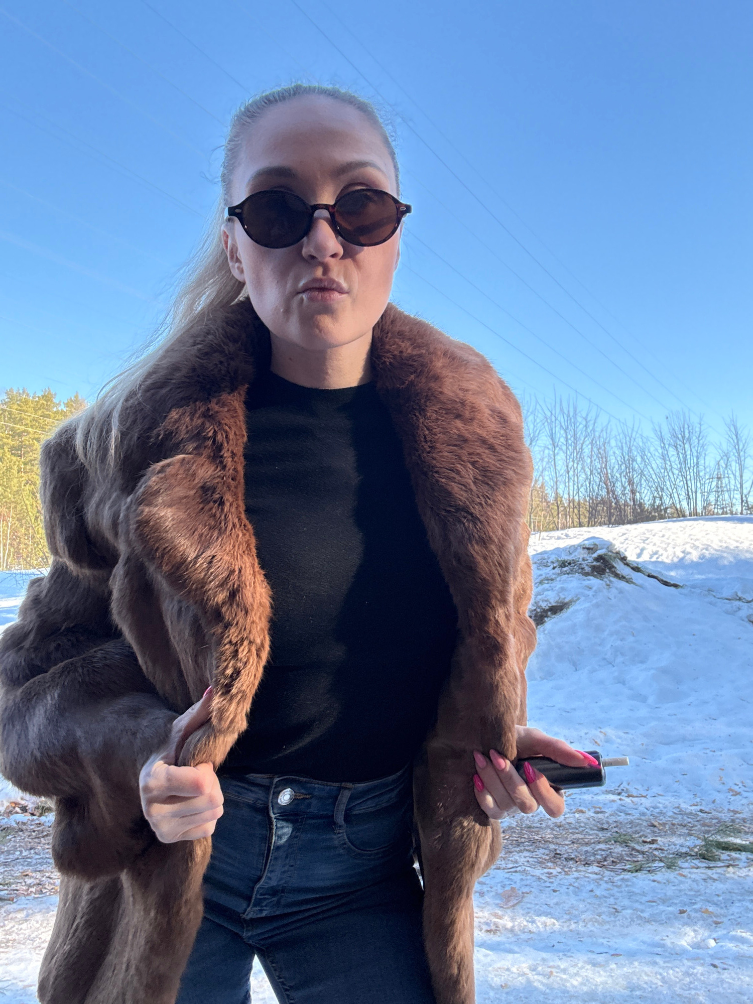 A female individual stands outdoors in Noviy, Russia, under a clear blue sky traversed by utility lines. She is viewed from the waist up, facing the camera with a neutral expression and slightly purse…read more