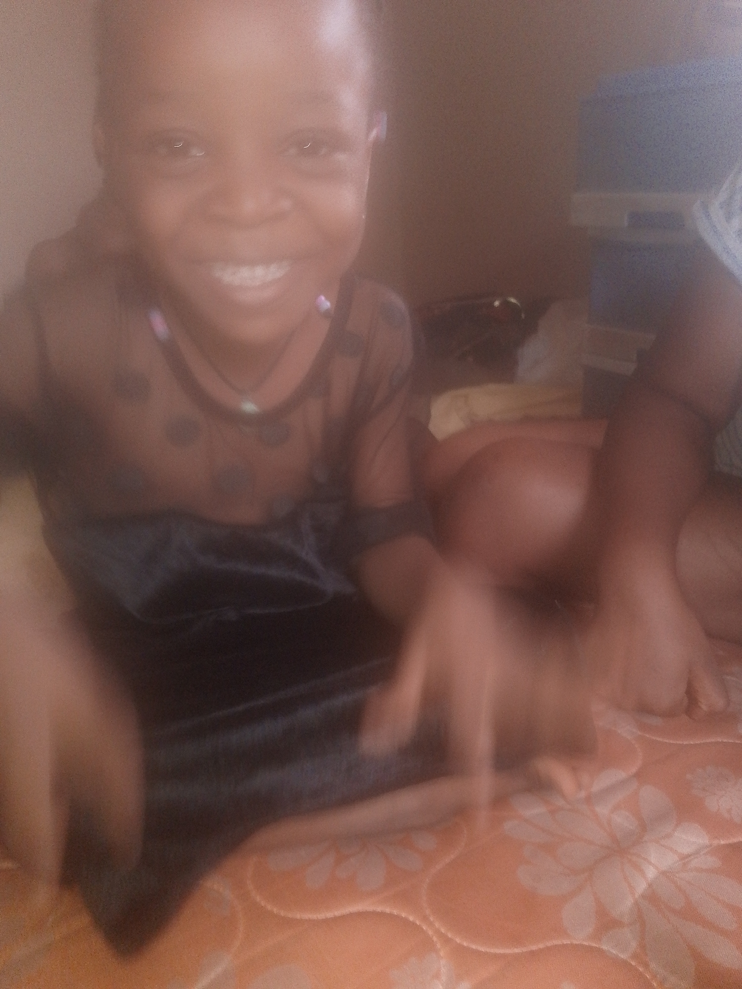 A child is sitting on an orange and white floral-patterned surface, possibly a bed or a padded floor. She is wearing a black velvet dress with a sheer, polka-dotted top. She has a necklace with colorfβ¦read more