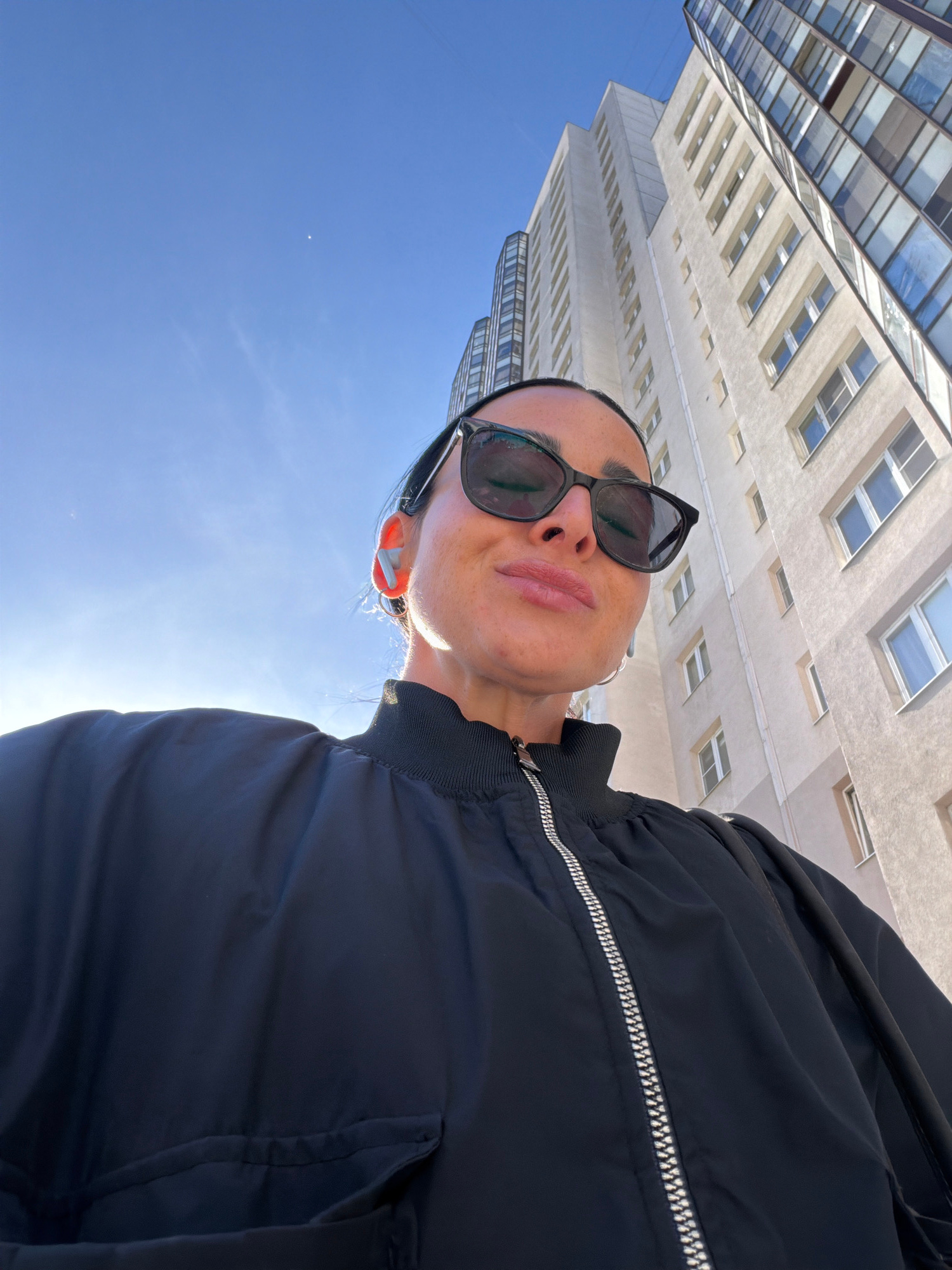 A low-angle shot captures a woman wearing sunglasses and a dark jacket against the backdrop of a blue sky and city buildings. The buildings exhibit a mix of architectural styles with repeating windows…read more