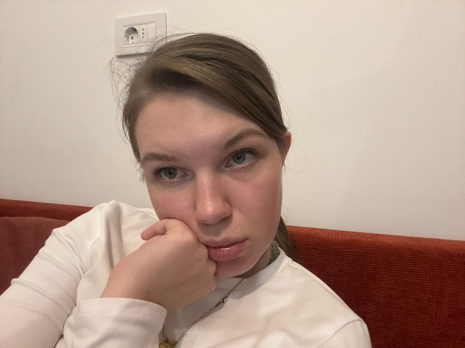 A woman is looking at the camera. Her face is in the bottom half of the image. She has fair skin, light brown hair and light green eyes. Her hair is styled to the side. She is wearing a white shirt, a…read more